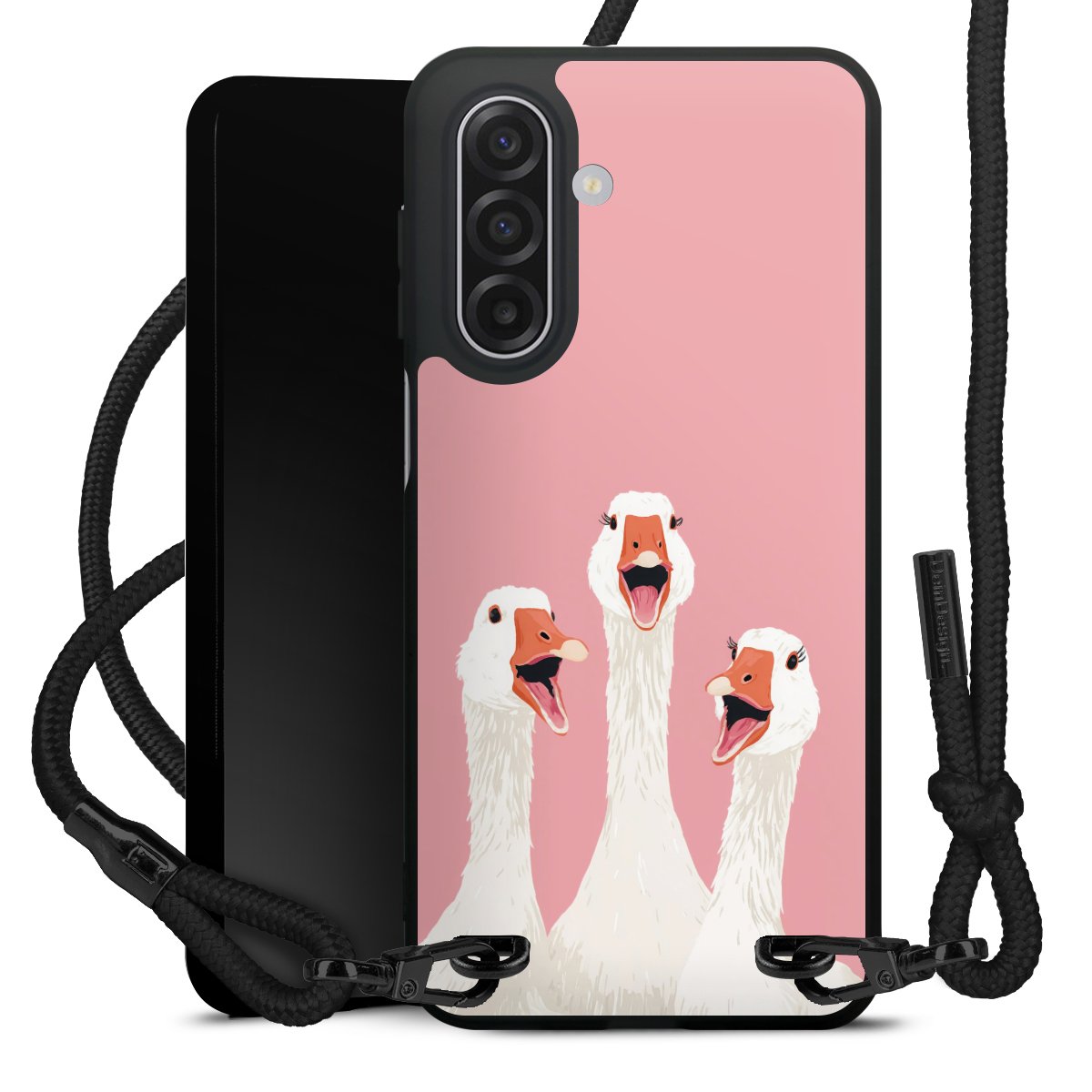 The matt black silicone case is made of flexible TPU (thermoplastic polyurethane) and offers robust protection. The durable, unbreakable material makes the cover flexible and dimensionally stable at the same time. The matte surface makes your design stand out more and is less susceptible to fingerprints and dirt. The stylish trend accessory fits comfortably in the hand and is perfectly complemented by the fabric (polyester) mobile phone strap. The braided fabric strap is approx. 1.70 metres long with a diameter of approx. 0.5 cm. Due to the special knotting technique, the length of the strap can be adjusted by simply pulling it, so that you can adapt it individually to your wishes. The practical case to wear around your neck is available with the fabric strap in black. As a little icing on the cake, we have provided the strap with a chic metal fastener in matt black. The strap is securely fastened to the case with loops made of high-quality genuine leather and press studs. The ends of the fabric strap are covered with metallic end caps and thus protected from fraying.