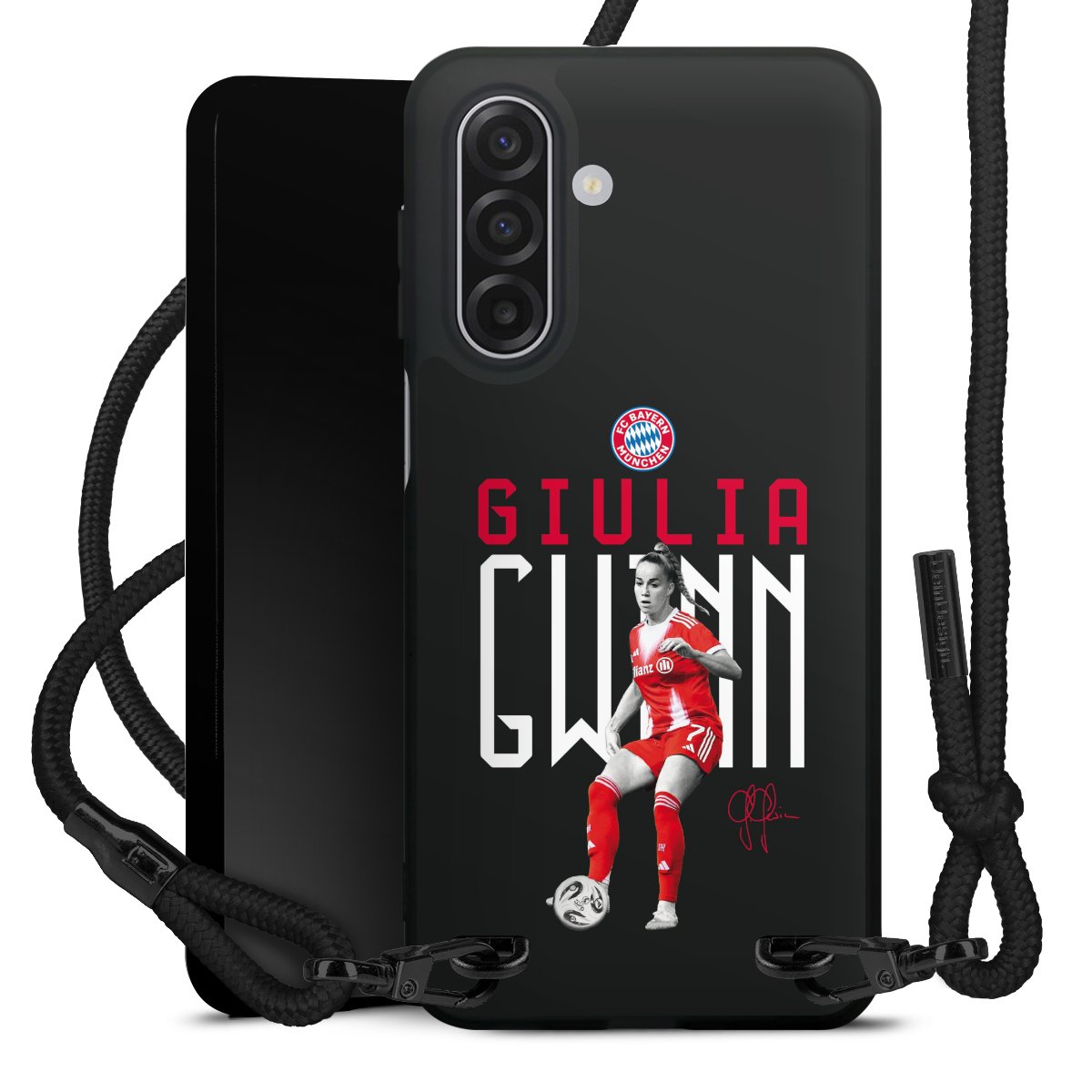 The matt black silicone case is made of flexible TPU (thermoplastic polyurethane) and offers robust protection. The durable, unbreakable material makes the cover flexible and dimensionally stable at the same time. The matte surface makes your design stand out more and is less susceptible to fingerprints and dirt. The stylish trend accessory fits comfortably in the hand and is perfectly complemented by the fabric (polyester) mobile phone strap. The braided fabric strap is approx. 1.70 metres long with a diameter of approx. 0.5 cm. Due to the special knotting technique, the length of the strap can be adjusted by simply pulling it, so that you can adapt it individually to your wishes. The practical case to wear around your neck is available with the fabric strap in black. As a little icing on the cake, we have provided the strap with a chic metal fastener in matt black. The strap is securely fastened to the case with loops made of high-quality genuine leather and press studs. The ends of the fabric strap are covered with metallic end caps and thus protected from fraying.