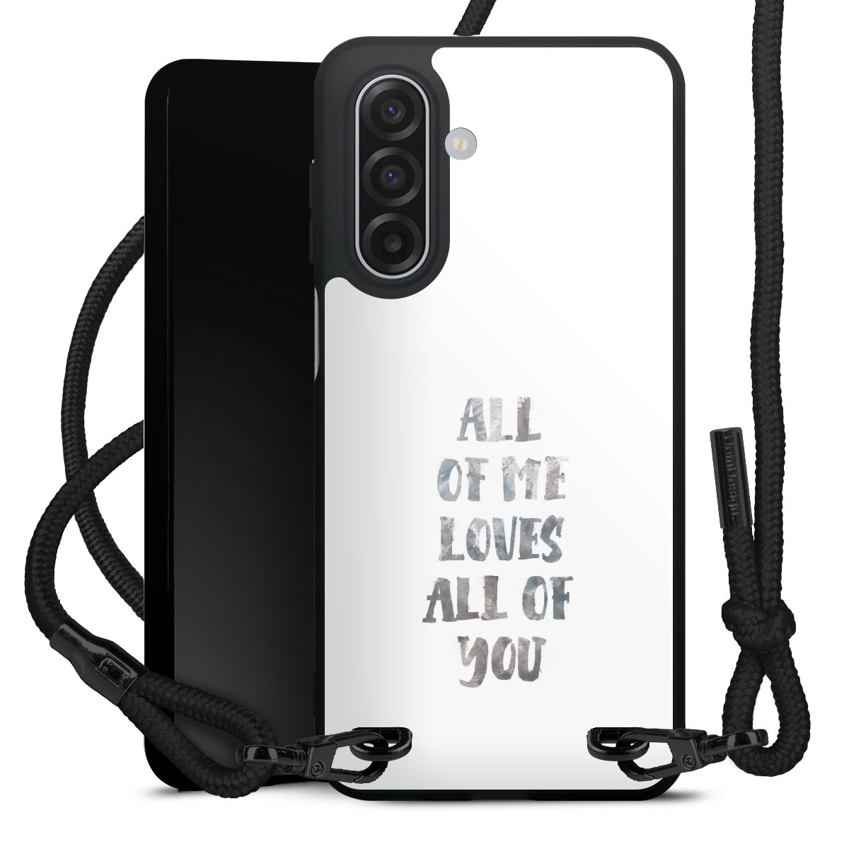 The matt black silicone case is made of flexible TPU (thermoplastic polyurethane) and offers robust protection. The durable, unbreakable material makes the cover flexible and dimensionally stable at the same time. The matte surface makes your design stand out more and is less susceptible to fingerprints and dirt. The stylish trend accessory fits comfortably in the hand and is perfectly complemented by the fabric (polyester) mobile phone strap. The braided fabric strap is approx. 1.70 metres long with a diameter of approx. 0.5 cm. Due to the special knotting technique, the length of the strap can be adjusted by simply pulling it, so that you can adapt it individually to your wishes. The practical case to wear around your neck is available with the fabric strap in black. As a little icing on the cake, we have provided the strap with a chic metal fastener in matt black. The strap is securely fastened to the case with loops made of high-quality genuine leather and press studs. The ends of the fabric strap are covered with metallic end caps and thus protected from fraying.
