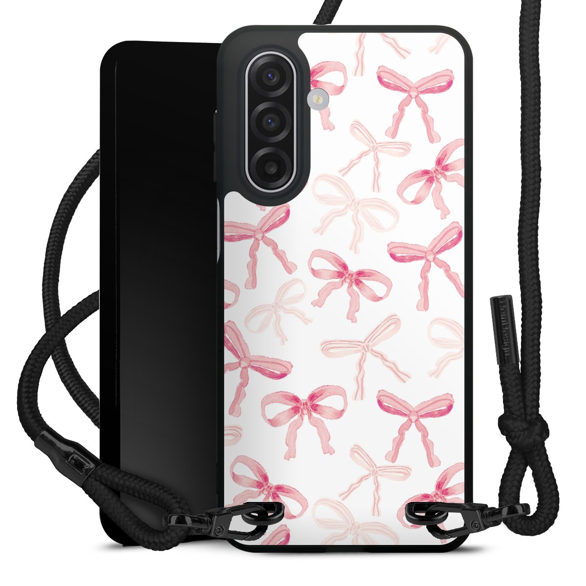 The matt black silicone case is made of flexible TPU (thermoplastic polyurethane) and offers robust protection. The durable, unbreakable material makes the cover flexible and dimensionally stable at the same time. The matte surface makes your design stand out more and is less susceptible to fingerprints and dirt. The stylish trend accessory fits comfortably in the hand and is perfectly complemented by the fabric (polyester) mobile phone strap. The braided fabric strap is approx. 1.70 metres long with a diameter of approx. 0.5 cm. Due to the special knotting technique, the length of the strap can be adjusted by simply pulling it, so that you can adapt it individually to your wishes. The practical case to wear around your neck is available with the fabric strap in black. As a little icing on the cake, we have provided the strap with a chic metal fastener in matt black. The strap is securely fastened to the case with loops made of high-quality genuine leather and press studs. The ends of the fabric strap are covered with metallic end caps and thus protected from fraying.