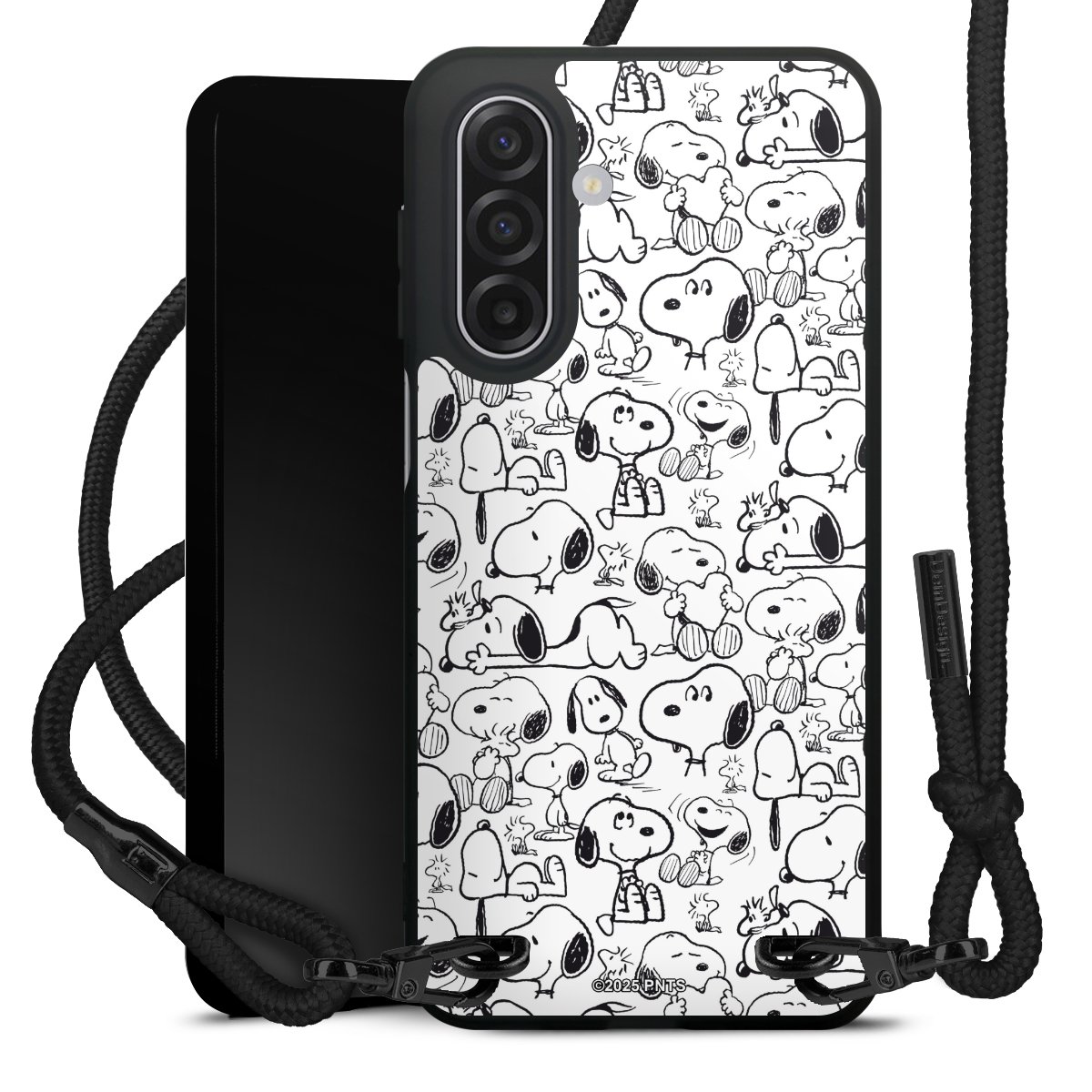 The matt black silicone case is made of flexible TPU (thermoplastic polyurethane) and offers robust protection. The durable, unbreakable material makes the cover flexible and dimensionally stable at the same time. The matte surface makes your design stand out more and is less susceptible to fingerprints and dirt. The stylish trend accessory fits comfortably in the hand and is perfectly complemented by the fabric (polyester) mobile phone strap. The braided fabric strap is approx. 1.70 metres long with a diameter of approx. 0.5 cm. Due to the special knotting technique, the length of the strap can be adjusted by simply pulling it, so that you can adapt it individually to your wishes. The practical case to wear around your neck is available with the fabric strap in black. As a little icing on the cake, we have provided the strap with a chic metal fastener in matt black. The strap is securely fastened to the case with loops made of high-quality genuine leather and press studs. The ends of the fabric strap are covered with metallic end caps and thus protected from fraying.