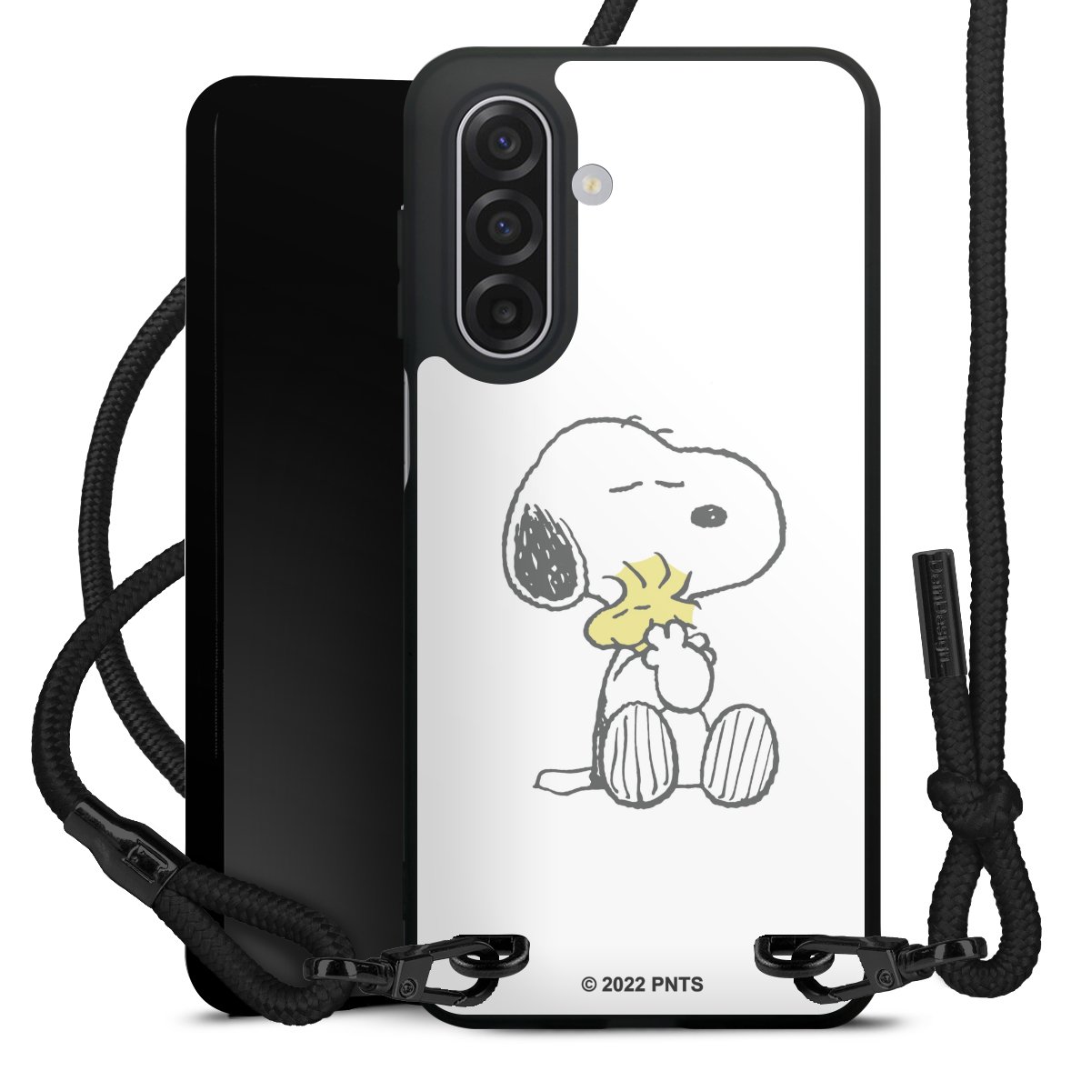 The matt black silicone case is made of flexible TPU (thermoplastic polyurethane) and offers robust protection. The durable, unbreakable material makes the cover flexible and dimensionally stable at the same time. The matte surface makes your design stand out more and is less susceptible to fingerprints and dirt. The stylish trend accessory fits comfortably in the hand and is perfectly complemented by the fabric (polyester) mobile phone strap. The braided fabric strap is approx. 1.70 metres long with a diameter of approx. 0.5 cm. Due to the special knotting technique, the length of the strap can be adjusted by simply pulling it, so that you can adapt it individually to your wishes. The practical case to wear around your neck is available with the fabric strap in black. As a little icing on the cake, we have provided the strap with a chic metal fastener in matt black. The strap is securely fastened to the case with loops made of high-quality genuine leather and press studs. The ends of the fabric strap are covered with metallic end caps and thus protected from fraying.