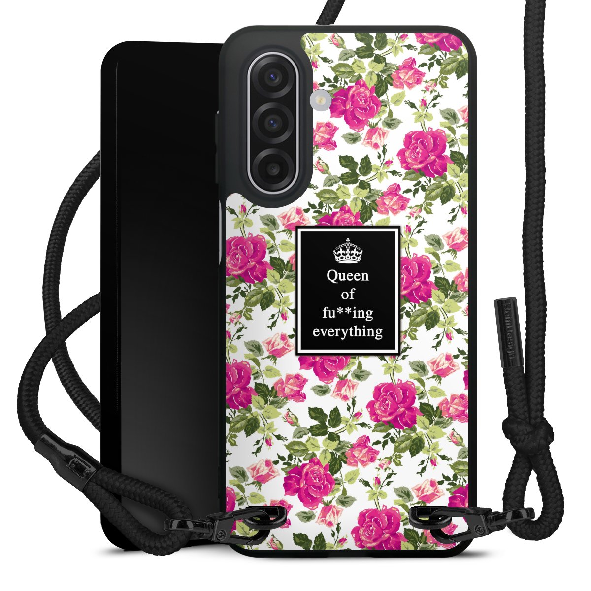 The matt black silicone case is made of flexible TPU (thermoplastic polyurethane) and offers robust protection. The durable, unbreakable material makes the cover flexible and dimensionally stable at the same time. The matte surface makes your design stand out more and is less susceptible to fingerprints and dirt. The stylish trend accessory fits comfortably in the hand and is perfectly complemented by the fabric (polyester) mobile phone strap. The braided fabric strap is approx. 1.70 metres long with a diameter of approx. 0.5 cm. Due to the special knotting technique, the length of the strap can be adjusted by simply pulling it, so that you can adapt it individually to your wishes. The practical case to wear around your neck is available with the fabric strap in black. As a little icing on the cake, we have provided the strap with a chic metal fastener in matt black. The strap is securely fastened to the case with loops made of high-quality genuine leather and press studs. The ends of the fabric strap are covered with metallic end caps and thus protected from fraying.