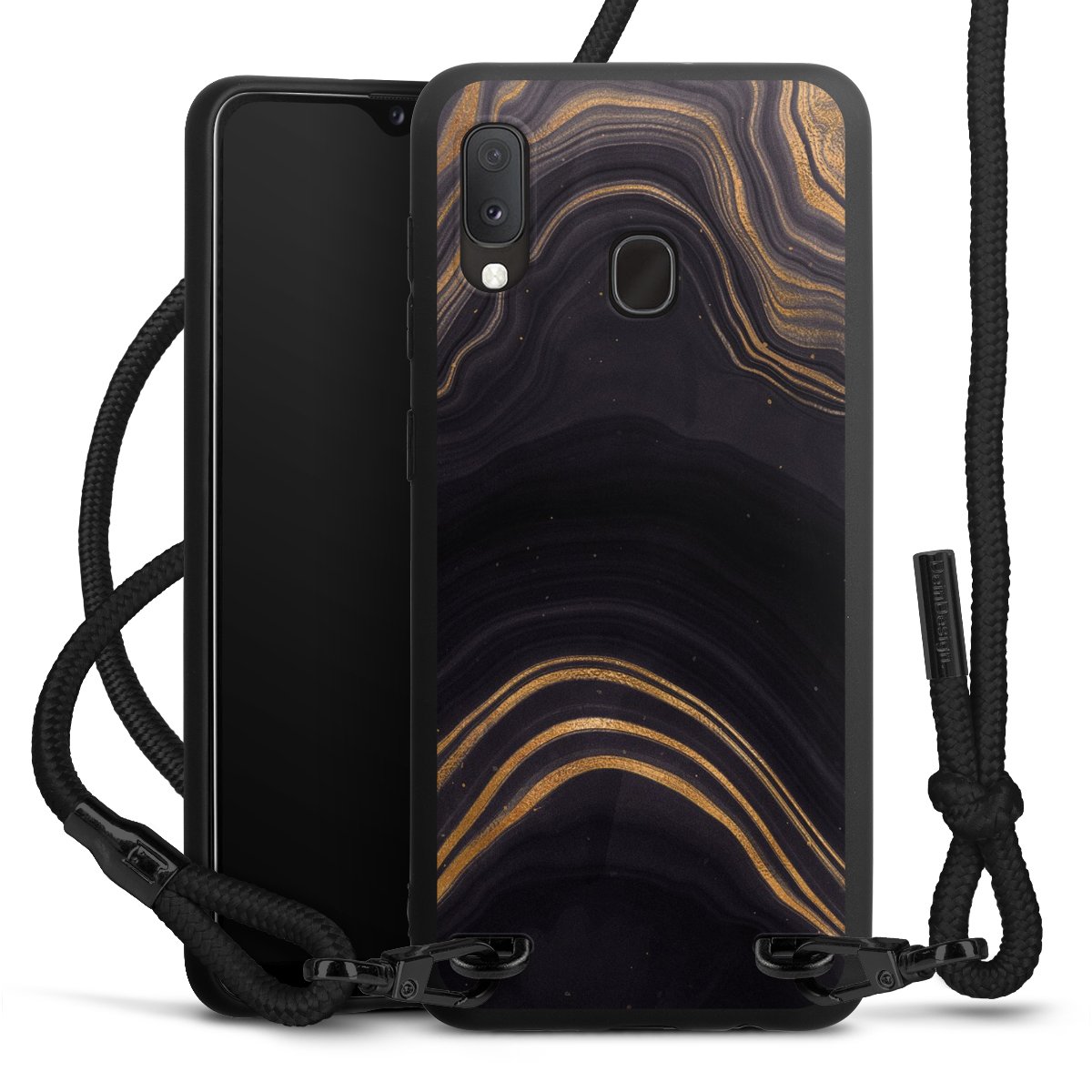The matt black silicone case is made of flexible TPU (thermoplastic polyurethane) and offers robust protection. The durable, unbreakable material makes the cover flexible and dimensionally stable at the same time. The matte surface makes your design stand out more and is less susceptible to fingerprints and dirt. The stylish trend accessory fits comfortably in the hand and is perfectly complemented by the fabric (polyester) mobile phone strap. The braided fabric strap is approx. 1.70 metres long with a diameter of approx. 0.5 cm. Due to the special knotting technique, the length of the strap can be adjusted by simply pulling it, so that you can adapt it individually to your wishes. The practical case to wear around your neck is available with the fabric strap in black. As a little icing on the cake, we have provided the strap with a chic metal fastener in matt black. The strap is securely fastened to the case with loops made of high-quality genuine leather and press studs. The ends of the fabric strap are covered with metallic end caps and thus protected from fraying.