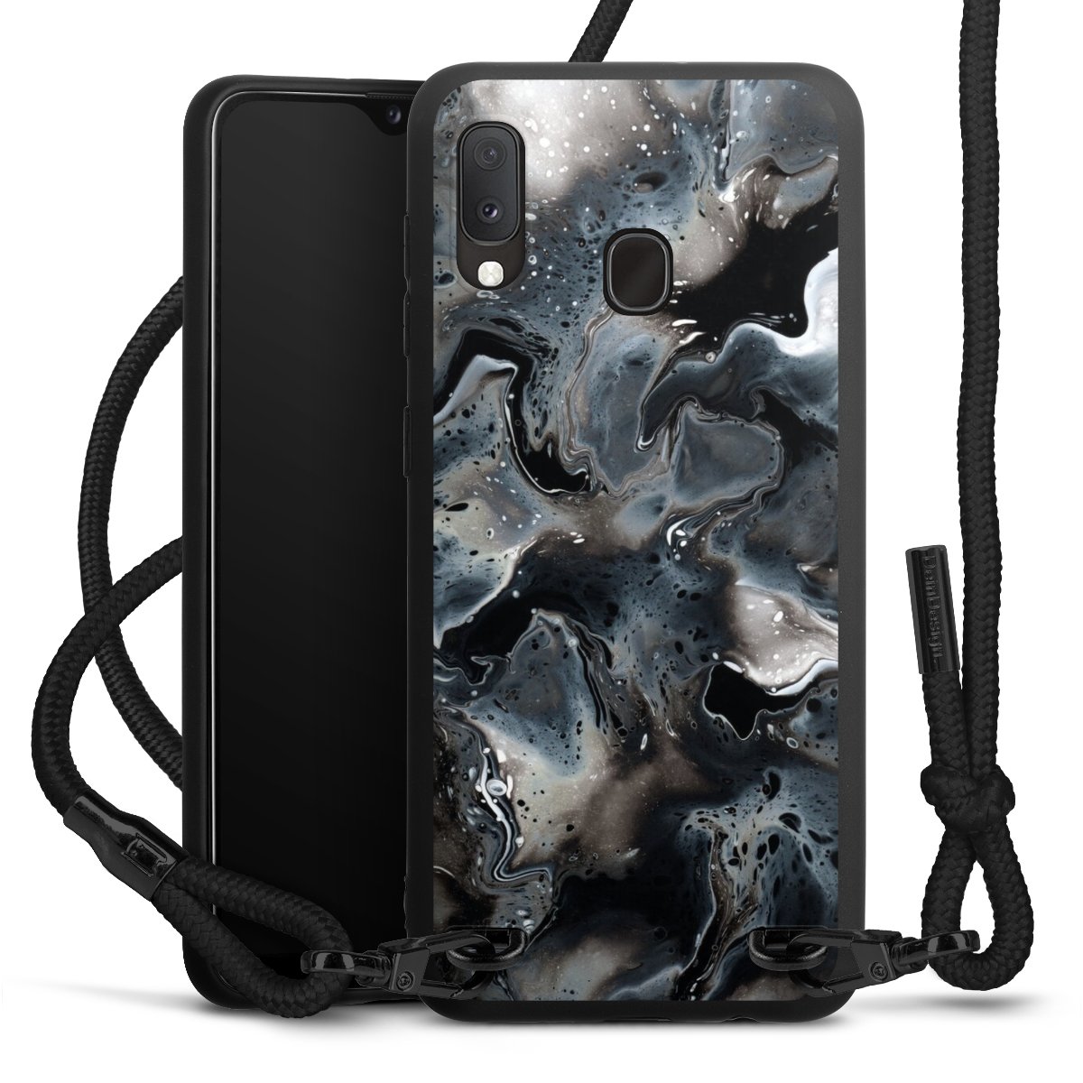 The matt black silicone case is made of flexible TPU (thermoplastic polyurethane) and offers robust protection. The durable, unbreakable material makes the cover flexible and dimensionally stable at the same time. The matte surface makes your design stand out more and is less susceptible to fingerprints and dirt. The stylish trend accessory fits comfortably in the hand and is perfectly complemented by the fabric (polyester) mobile phone strap. The braided fabric strap is approx. 1.70 metres long with a diameter of approx. 0.5 cm. Due to the special knotting technique, the length of the strap can be adjusted by simply pulling it, so that you can adapt it individually to your wishes. The practical case to wear around your neck is available with the fabric strap in black. As a little icing on the cake, we have provided the strap with a chic metal fastener in matt black. The strap is securely fastened to the case with loops made of high-quality genuine leather and press studs. The ends of the fabric strap are covered with metallic end caps and thus protected from fraying.