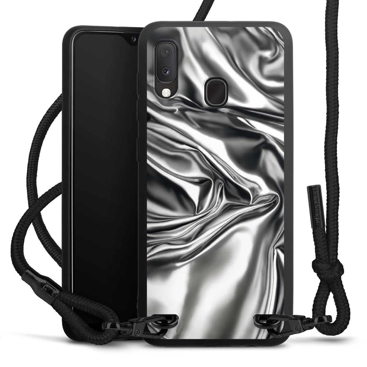 The matt black silicone case is made of flexible TPU (thermoplastic polyurethane) and offers robust protection. The durable, unbreakable material makes the cover flexible and dimensionally stable at the same time. The matte surface makes your design stand out more and is less susceptible to fingerprints and dirt. The stylish trend accessory fits comfortably in the hand and is perfectly complemented by the fabric (polyester) mobile phone strap. The braided fabric strap is approx. 1.70 metres long with a diameter of approx. 0.5 cm. Due to the special knotting technique, the length of the strap can be adjusted by simply pulling it, so that you can adapt it individually to your wishes. The practical case to wear around your neck is available with the fabric strap in black. As a little icing on the cake, we have provided the strap with a chic metal fastener in matt black. The strap is securely fastened to the case with loops made of high-quality genuine leather and press studs. The ends of the fabric strap are covered with metallic end caps and thus protected from fraying.
