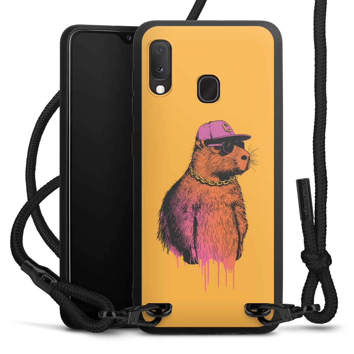 We use the solid direct print process for this phone case, which is why the print area only covers the back and the edge remains unprinted. The case to wear around your neck can be ordered unprinted, fully printed, or partially printed. For your design, either choose one of our exclusive shop motifs or get creative and create your own design, for example with photos and overlays. Design your own personal trend accessory and make an individual statement on the streets!