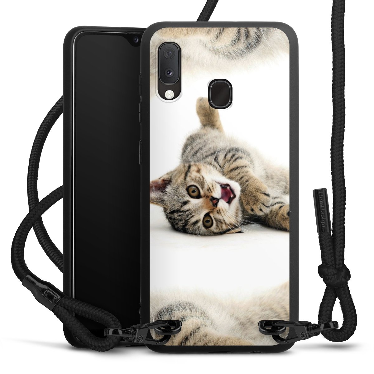 The matt black silicone case is made of flexible TPU (thermoplastic polyurethane) and offers robust protection. The durable, unbreakable material makes the cover flexible and dimensionally stable at the same time. The matte surface makes your design stand out more and is less susceptible to fingerprints and dirt. The stylish trend accessory fits comfortably in the hand and is perfectly complemented by the fabric (polyester) mobile phone strap. The braided fabric strap is approx. 1.70 metres long with a diameter of approx. 0.5 cm. Due to the special knotting technique, the length of the strap can be adjusted by simply pulling it, so that you can adapt it individually to your wishes. The practical case to wear around your neck is available with the fabric strap in black. As a little icing on the cake, we have provided the strap with a chic metal fastener in matt black. The strap is securely fastened to the case with loops made of high-quality genuine leather and press studs. The ends of the fabric strap are covered with metallic end caps and thus protected from fraying.