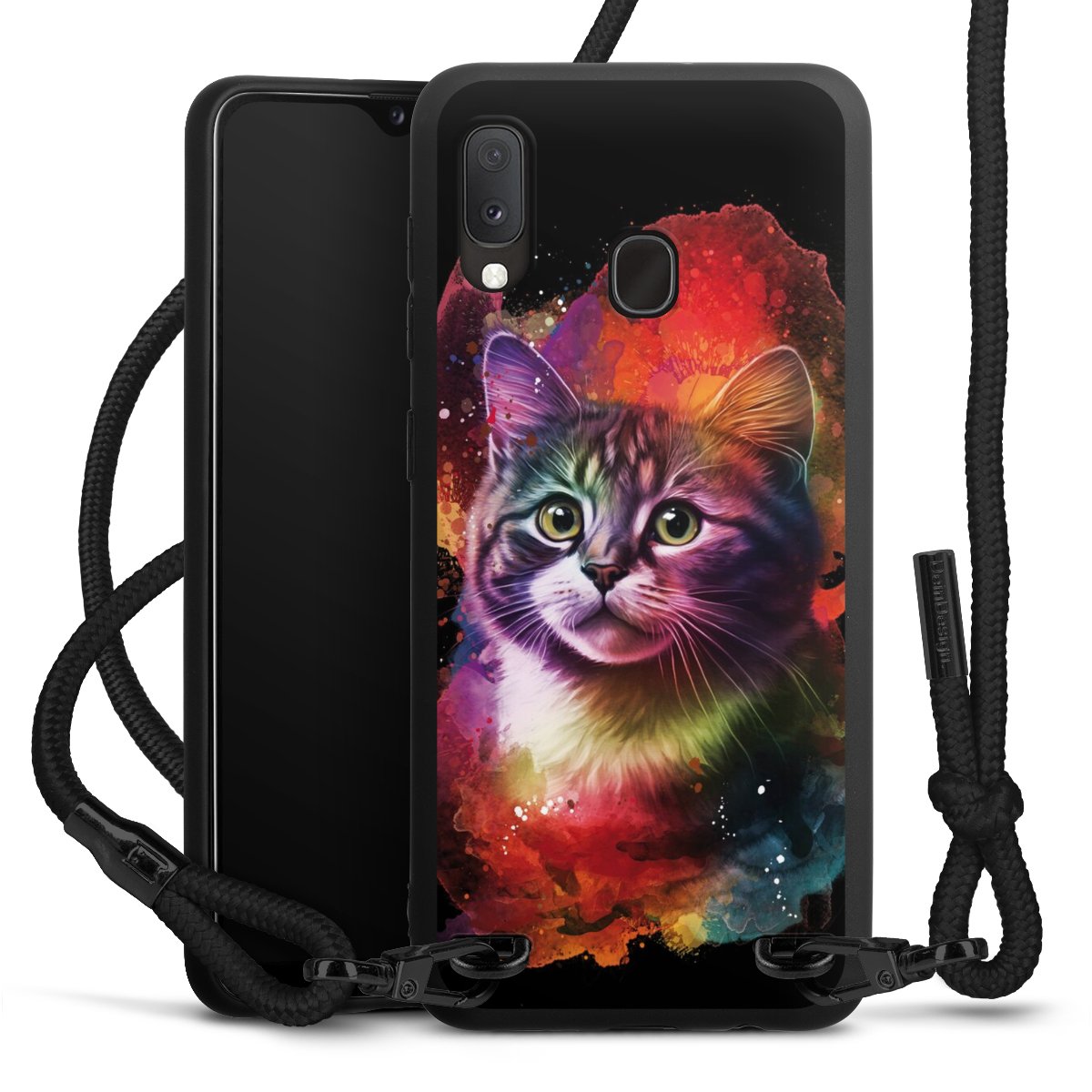 The matt black silicone case is made of flexible TPU (thermoplastic polyurethane) and offers robust protection. The durable, unbreakable material makes the cover flexible and dimensionally stable at the same time. The matte surface makes your design stand out more and is less susceptible to fingerprints and dirt. The stylish trend accessory fits comfortably in the hand and is perfectly complemented by the fabric (polyester) mobile phone strap. The braided fabric strap is approx. 1.70 metres long with a diameter of approx. 0.5 cm. Due to the special knotting technique, the length of the strap can be adjusted by simply pulling it, so that you can adapt it individually to your wishes. The practical case to wear around your neck is available with the fabric strap in black. As a little icing on the cake, we have provided the strap with a chic metal fastener in matt black. The strap is securely fastened to the case with loops made of high-quality genuine leather and press studs. The ends of the fabric strap are covered with metallic end caps and thus protected from fraying.