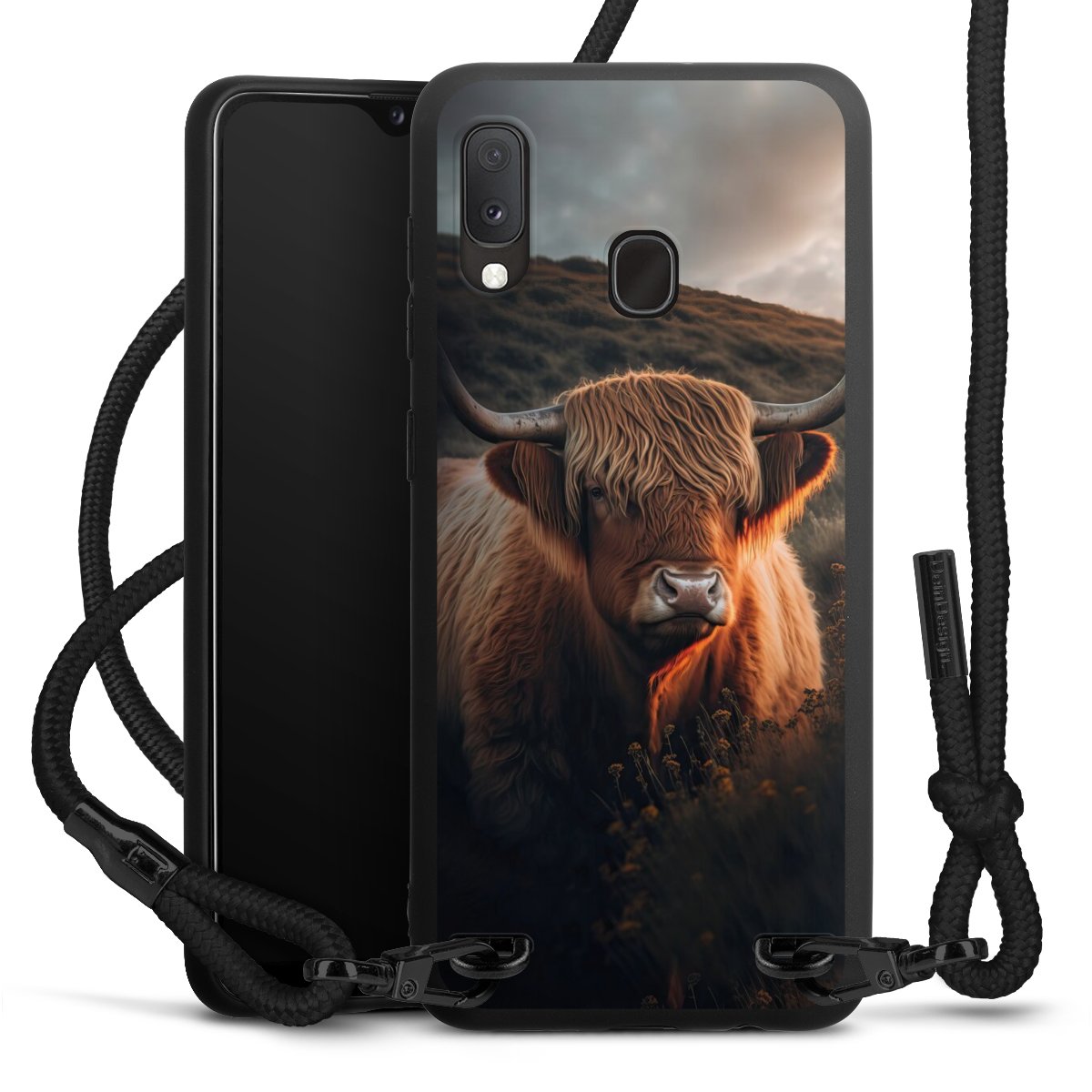 The matt black silicone case is made of flexible TPU (thermoplastic polyurethane) and offers robust protection. The durable, unbreakable material makes the cover flexible and dimensionally stable at the same time. The matte surface makes your design stand out more and is less susceptible to fingerprints and dirt. The stylish trend accessory fits comfortably in the hand and is perfectly complemented by the fabric (polyester) mobile phone strap. The braided fabric strap is approx. 1.70 metres long with a diameter of approx. 0.5 cm. Due to the special knotting technique, the length of the strap can be adjusted by simply pulling it, so that you can adapt it individually to your wishes. The practical case to wear around your neck is available with the fabric strap in black. As a little icing on the cake, we have provided the strap with a chic metal fastener in matt black. The strap is securely fastened to the case with loops made of high-quality genuine leather and press studs. The ends of the fabric strap are covered with metallic end caps and thus protected from fraying.