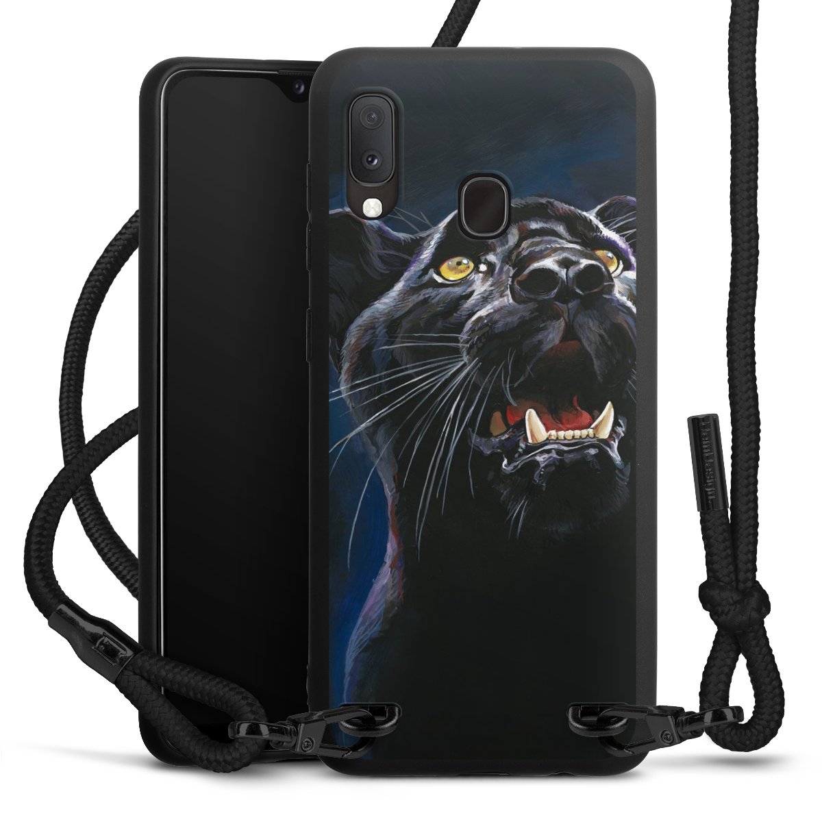The matt black silicone case is made of flexible TPU (thermoplastic polyurethane) and offers robust protection. The durable, unbreakable material makes the cover flexible and dimensionally stable at the same time. The matte surface makes your design stand out more and is less susceptible to fingerprints and dirt. The stylish trend accessory fits comfortably in the hand and is perfectly complemented by the fabric (polyester) mobile phone strap. The braided fabric strap is approx. 1.70 metres long with a diameter of approx. 0.5 cm. Due to the special knotting technique, the length of the strap can be adjusted by simply pulling it, so that you can adapt it individually to your wishes. The practical case to wear around your neck is available with the fabric strap in black. As a little icing on the cake, we have provided the strap with a chic metal fastener in matt black. The strap is securely fastened to the case with loops made of high-quality genuine leather and press studs. The ends of the fabric strap are covered with metallic end caps and thus protected from fraying.