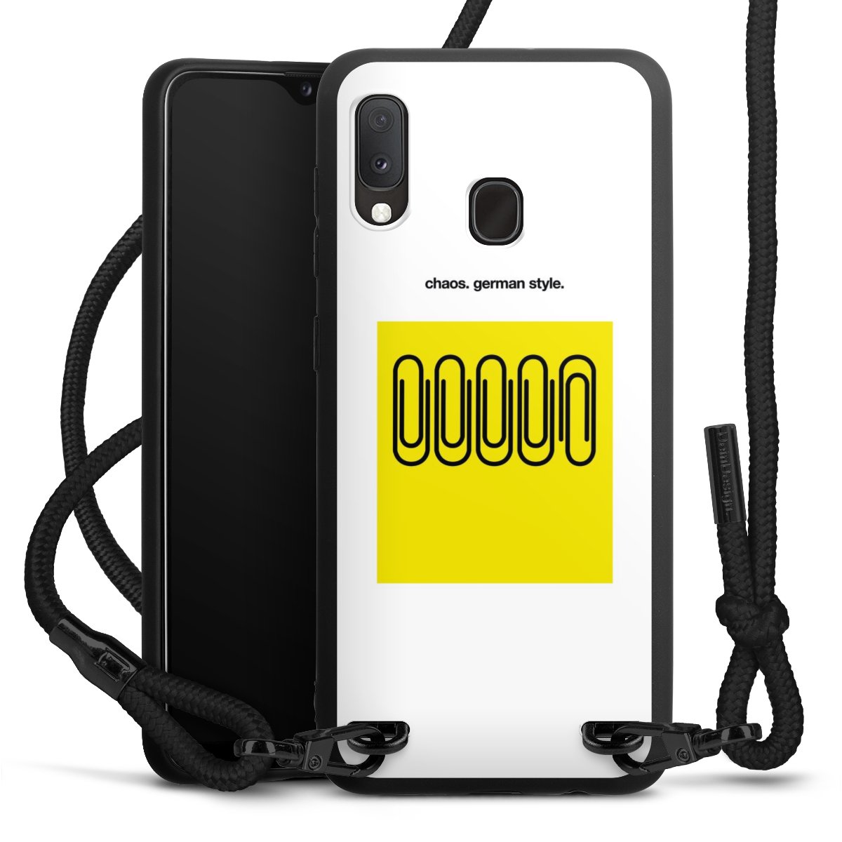 The matt black silicone case is made of flexible TPU (thermoplastic polyurethane) and offers robust protection. The durable, unbreakable material makes the cover flexible and dimensionally stable at the same time. The matte surface makes your design stand out more and is less susceptible to fingerprints and dirt. The stylish trend accessory fits comfortably in the hand and is perfectly complemented by the fabric (polyester) mobile phone strap. The braided fabric strap is approx. 1.70 metres long with a diameter of approx. 0.5 cm. Due to the special knotting technique, the length of the strap can be adjusted by simply pulling it, so that you can adapt it individually to your wishes. The practical case to wear around your neck is available with the fabric strap in black. As a little icing on the cake, we have provided the strap with a chic metal fastener in matt black. The strap is securely fastened to the case with loops made of high-quality genuine leather and press studs. The ends of the fabric strap are covered with metallic end caps and thus protected from fraying.