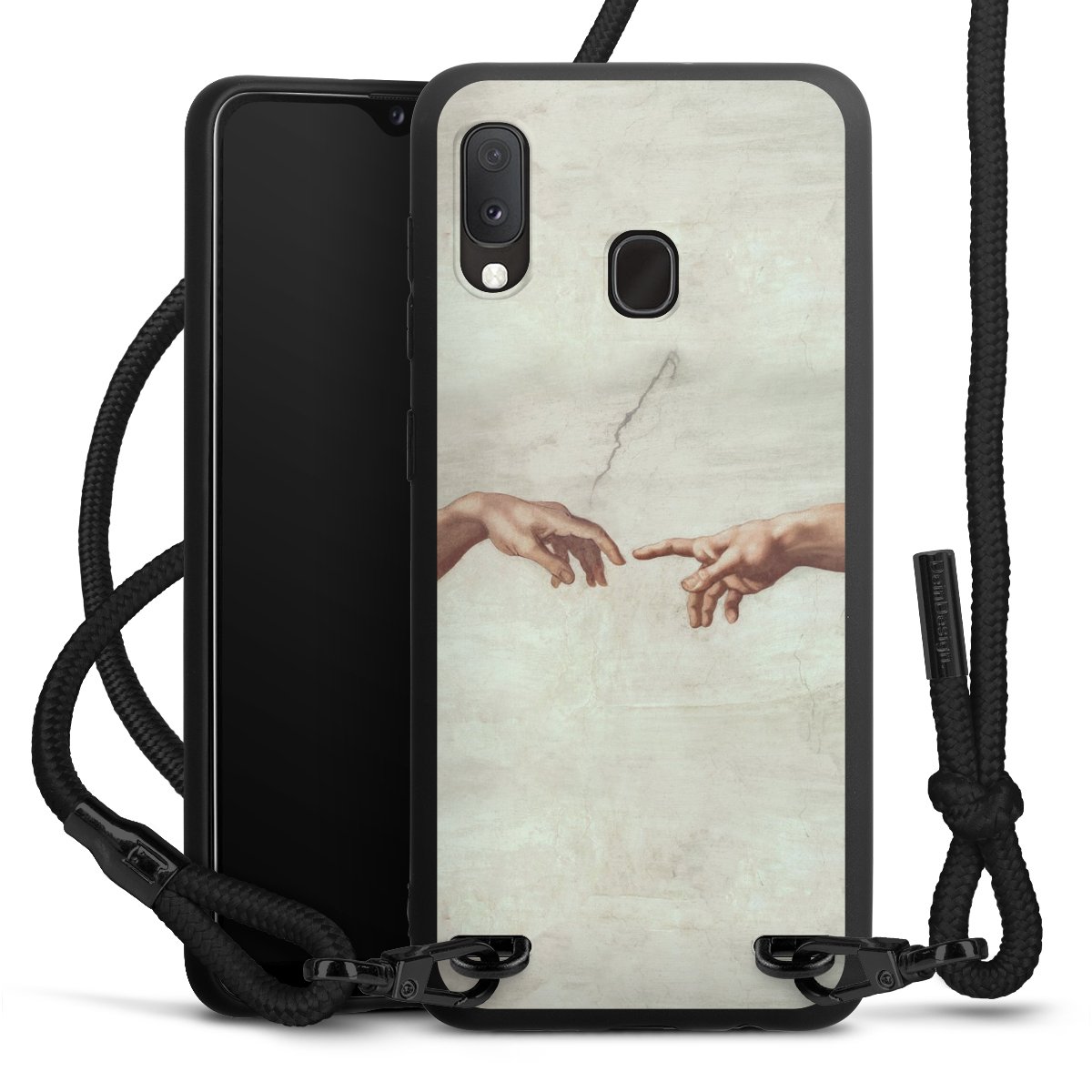 The matt black silicone case is made of flexible TPU (thermoplastic polyurethane) and offers robust protection. The durable, unbreakable material makes the cover flexible and dimensionally stable at the same time. The matte surface makes your design stand out more and is less susceptible to fingerprints and dirt. The stylish trend accessory fits comfortably in the hand and is perfectly complemented by the fabric (polyester) mobile phone strap. The braided fabric strap is approx. 1.70 metres long with a diameter of approx. 0.5 cm. Due to the special knotting technique, the length of the strap can be adjusted by simply pulling it, so that you can adapt it individually to your wishes. The practical case to wear around your neck is available with the fabric strap in black. As a little icing on the cake, we have provided the strap with a chic metal fastener in matt black. The strap is securely fastened to the case with loops made of high-quality genuine leather and press studs. The ends of the fabric strap are covered with metallic end caps and thus protected from fraying.