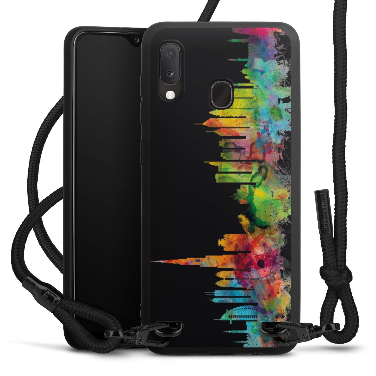 We use the solid direct print process for this phone case, which is why the print area only covers the back and the edge remains unprinted. The case to wear around your neck can be ordered unprinted, fully printed, or partially printed. For your design, either choose one of our exclusive shop motifs or get creative and create your own design, for example with photos and overlays. Design your own personal trend accessory and make an individual statement on the streets!