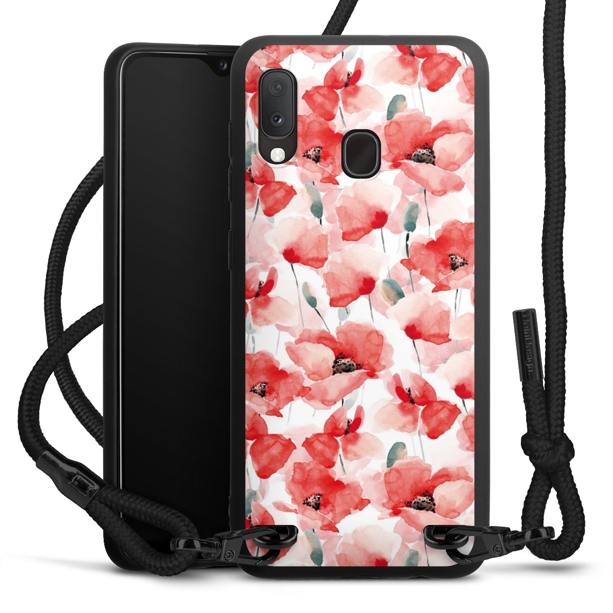 The matt black silicone case is made of flexible TPU (thermoplastic polyurethane) and offers robust protection. The durable, unbreakable material makes the cover flexible and dimensionally stable at the same time. The matte surface makes your design stand out more and is less susceptible to fingerprints and dirt. The stylish trend accessory fits comfortably in the hand and is perfectly complemented by the fabric (polyester) mobile phone strap. The braided fabric strap is approx. 1.70 metres long with a diameter of approx. 0.5 cm. Due to the special knotting technique, the length of the strap can be adjusted by simply pulling it, so that you can adapt it individually to your wishes. The practical case to wear around your neck is available with the fabric strap in black. As a little icing on the cake, we have provided the strap with a chic metal fastener in matt black. The strap is securely fastened to the case with loops made of high-quality genuine leather and press studs. The ends of the fabric strap are covered with metallic end caps and thus protected from fraying.
