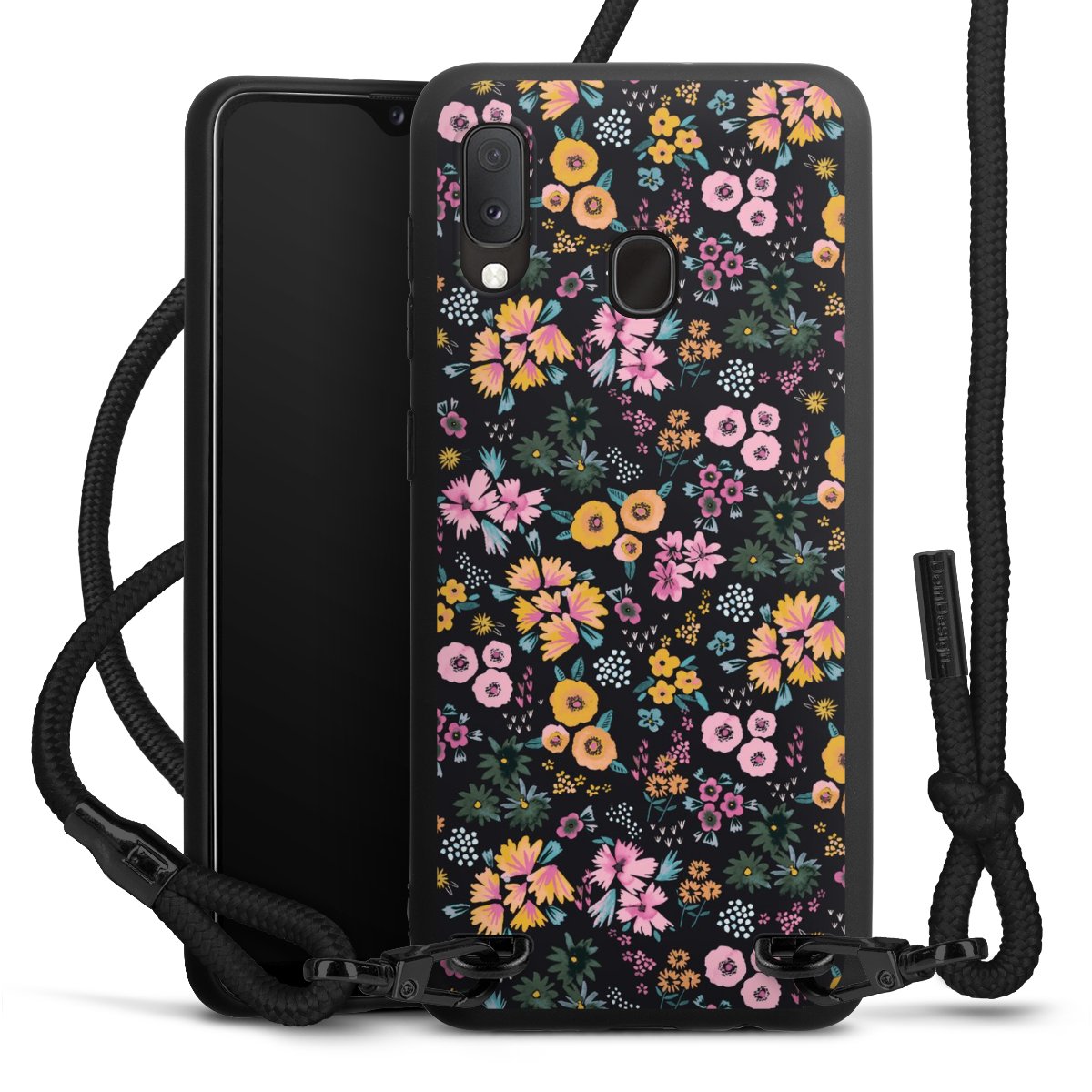 The matt black silicone case is made of flexible TPU (thermoplastic polyurethane) and offers robust protection. The durable, unbreakable material makes the cover flexible and dimensionally stable at the same time. The matte surface makes your design stand out more and is less susceptible to fingerprints and dirt. The stylish trend accessory fits comfortably in the hand and is perfectly complemented by the fabric (polyester) mobile phone strap. The braided fabric strap is approx. 1.70 metres long with a diameter of approx. 0.5 cm. Due to the special knotting technique, the length of the strap can be adjusted by simply pulling it, so that you can adapt it individually to your wishes. The practical case to wear around your neck is available with the fabric strap in black. As a little icing on the cake, we have provided the strap with a chic metal fastener in matt black. The strap is securely fastened to the case with loops made of high-quality genuine leather and press studs. The ends of the fabric strap are covered with metallic end caps and thus protected from fraying.