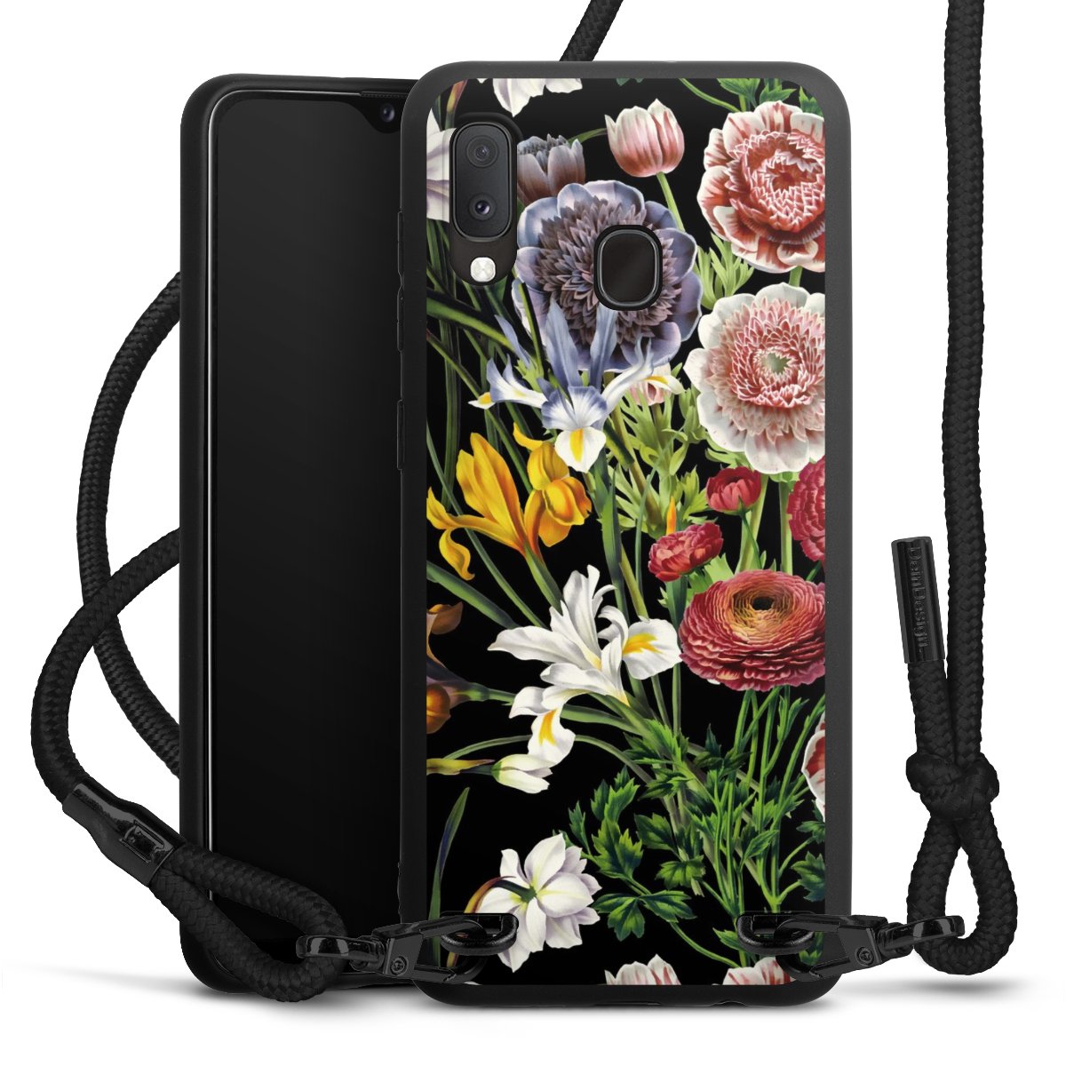 The matt black silicone case is made of flexible TPU (thermoplastic polyurethane) and offers robust protection. The durable, unbreakable material makes the cover flexible and dimensionally stable at the same time. The matte surface makes your design stand out more and is less susceptible to fingerprints and dirt. The stylish trend accessory fits comfortably in the hand and is perfectly complemented by the fabric (polyester) mobile phone strap. The braided fabric strap is approx. 1.70 metres long with a diameter of approx. 0.5 cm. Due to the special knotting technique, the length of the strap can be adjusted by simply pulling it, so that you can adapt it individually to your wishes. The practical case to wear around your neck is available with the fabric strap in black. As a little icing on the cake, we have provided the strap with a chic metal fastener in matt black. The strap is securely fastened to the case with loops made of high-quality genuine leather and press studs. The ends of the fabric strap are covered with metallic end caps and thus protected from fraying.
