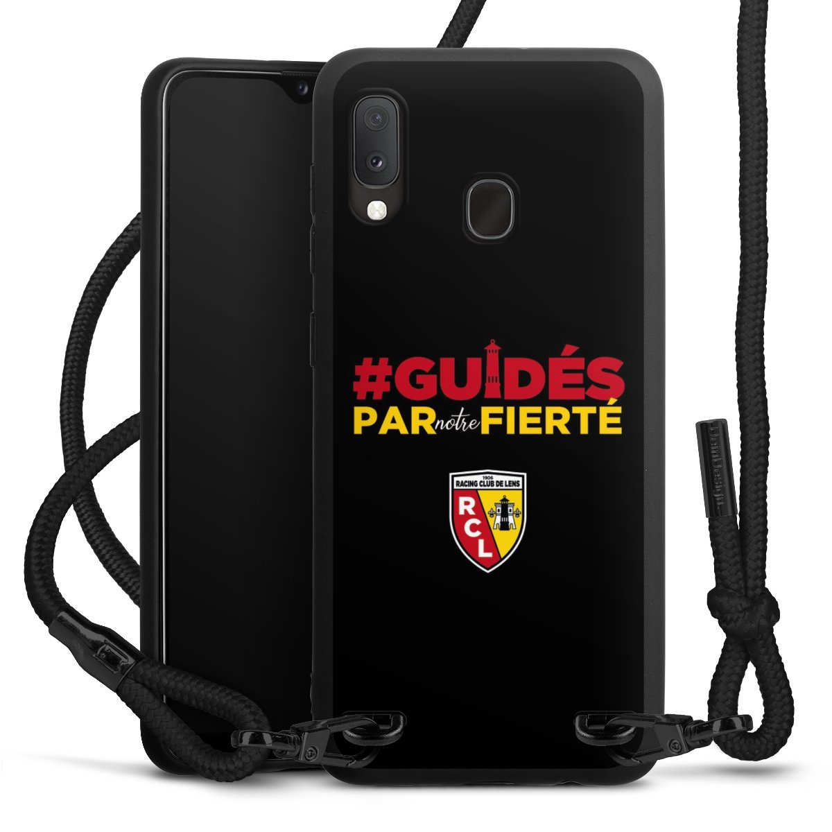 The matt black silicone case is made of flexible TPU (thermoplastic polyurethane) and offers robust protection. The durable, unbreakable material makes the cover flexible and dimensionally stable at the same time. The matte surface makes your design stand out more and is less susceptible to fingerprints and dirt. The stylish trend accessory fits comfortably in the hand and is perfectly complemented by the fabric (polyester) mobile phone strap. The braided fabric strap is approx. 1.70 metres long with a diameter of approx. 0.5 cm. Due to the special knotting technique, the length of the strap can be adjusted by simply pulling it, so that you can adapt it individually to your wishes. The practical case to wear around your neck is available with the fabric strap in black. As a little icing on the cake, we have provided the strap with a chic metal fastener in matt black. The strap is securely fastened to the case with loops made of high-quality genuine leather and press studs. The ends of the fabric strap are covered with metallic end caps and thus protected from fraying.
