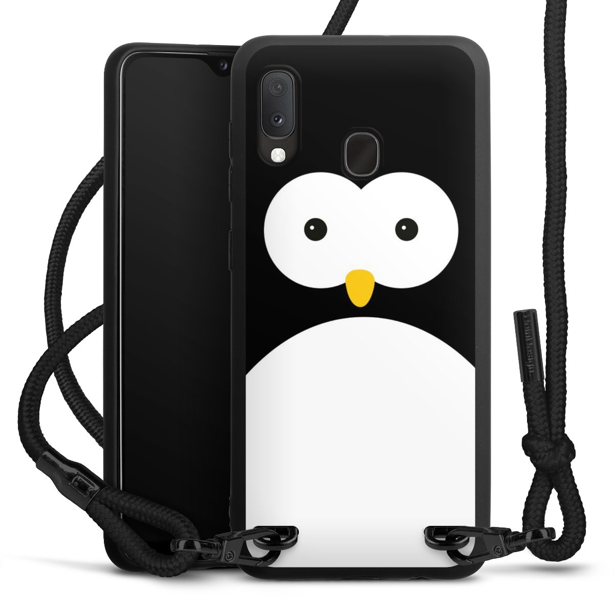 The matt black silicone case is made of flexible TPU (thermoplastic polyurethane) and offers robust protection. The durable, unbreakable material makes the cover flexible and dimensionally stable at the same time. The matte surface makes your design stand out more and is less susceptible to fingerprints and dirt. The stylish trend accessory fits comfortably in the hand and is perfectly complemented by the fabric (polyester) mobile phone strap. The braided fabric strap is approx. 1.70 metres long with a diameter of approx. 0.5 cm. Due to the special knotting technique, the length of the strap can be adjusted by simply pulling it, so that you can adapt it individually to your wishes. The practical case to wear around your neck is available with the fabric strap in black. As a little icing on the cake, we have provided the strap with a chic metal fastener in matt black. The strap is securely fastened to the case with loops made of high-quality genuine leather and press studs. The ends of the fabric strap are covered with metallic end caps and thus protected from fraying.