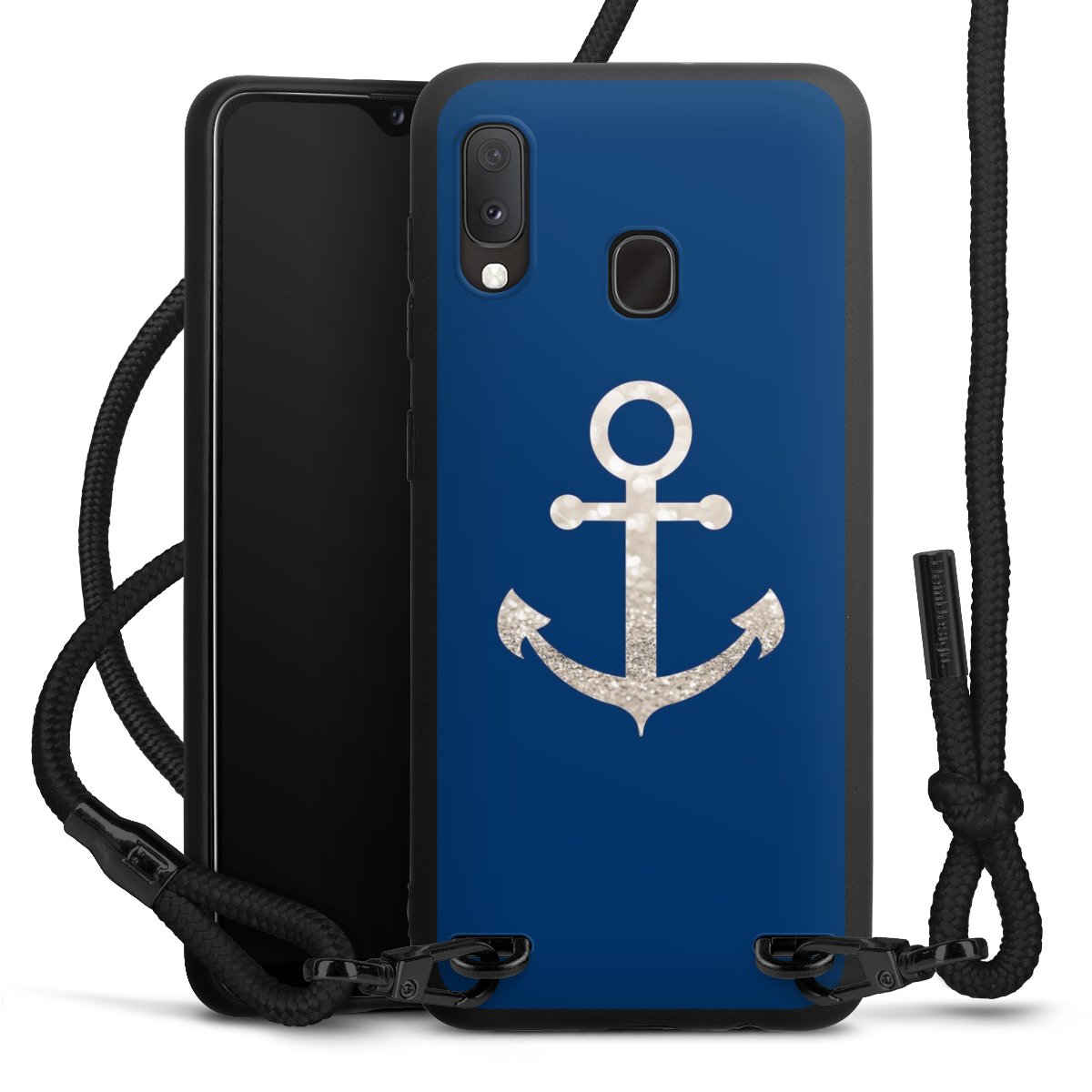 The matt black silicone case is made of flexible TPU (thermoplastic polyurethane) and offers robust protection. The durable, unbreakable material makes the cover flexible and dimensionally stable at the same time. The matte surface makes your design stand out more and is less susceptible to fingerprints and dirt. The stylish trend accessory fits comfortably in the hand and is perfectly complemented by the fabric (polyester) mobile phone strap. The braided fabric strap is approx. 1.70 metres long with a diameter of approx. 0.5 cm. Due to the special knotting technique, the length of the strap can be adjusted by simply pulling it, so that you can adapt it individually to your wishes. The practical case to wear around your neck is available with the fabric strap in black. As a little icing on the cake, we have provided the strap with a chic metal fastener in matt black. The strap is securely fastened to the case with loops made of high-quality genuine leather and press studs. The ends of the fabric strap are covered with metallic end caps and thus protected from fraying.