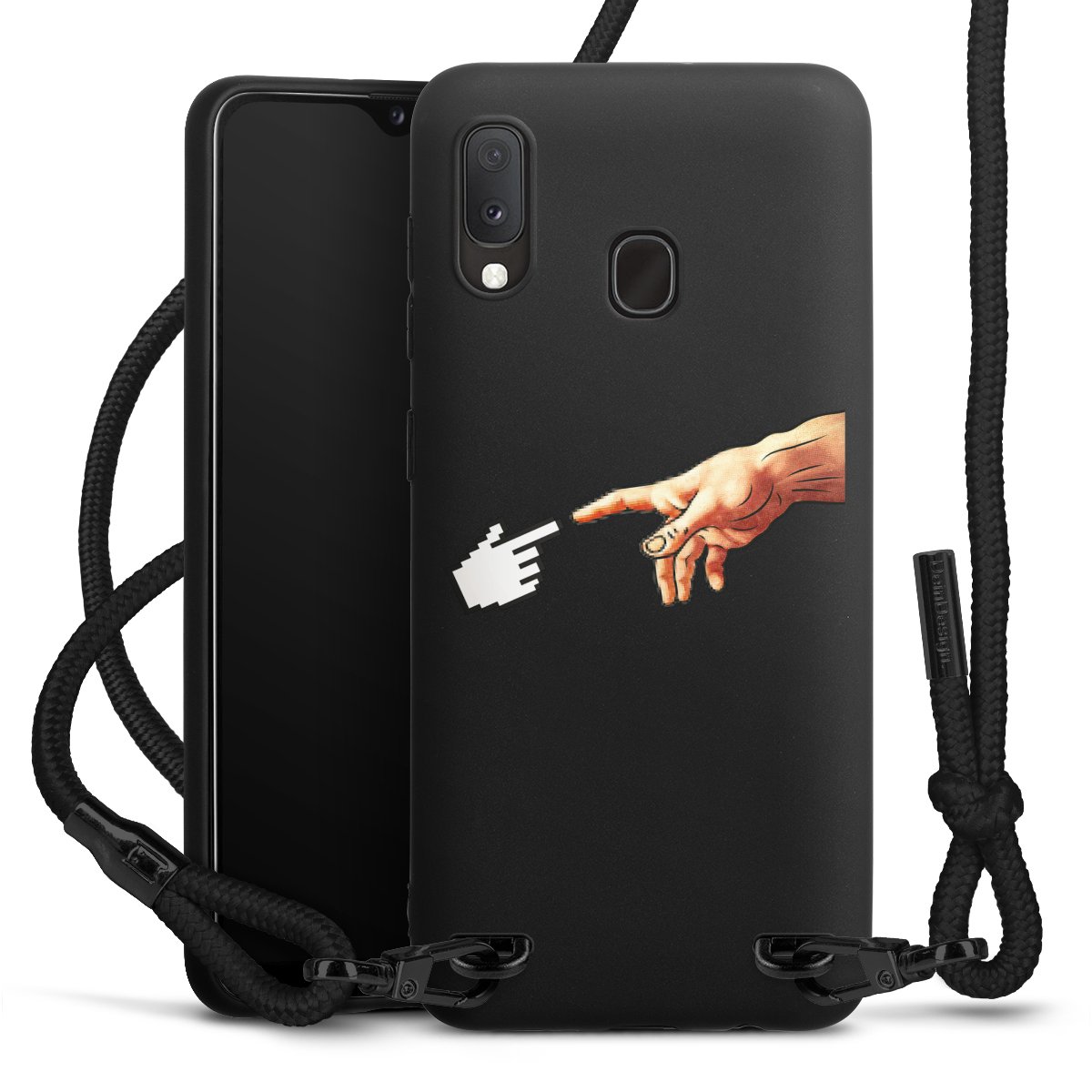 The matt black silicone case is made of flexible TPU (thermoplastic polyurethane) and offers robust protection. The durable, unbreakable material makes the cover flexible and dimensionally stable at the same time. The matte surface makes your design stand out more and is less susceptible to fingerprints and dirt. The stylish trend accessory fits comfortably in the hand and is perfectly complemented by the fabric (polyester) mobile phone strap. The braided fabric strap is approx. 1.70 metres long with a diameter of approx. 0.5 cm. Due to the special knotting technique, the length of the strap can be adjusted by simply pulling it, so that you can adapt it individually to your wishes. The practical case to wear around your neck is available with the fabric strap in black. As a little icing on the cake, we have provided the strap with a chic metal fastener in matt black. The strap is securely fastened to the case with loops made of high-quality genuine leather and press studs. The ends of the fabric strap are covered with metallic end caps and thus protected from fraying.