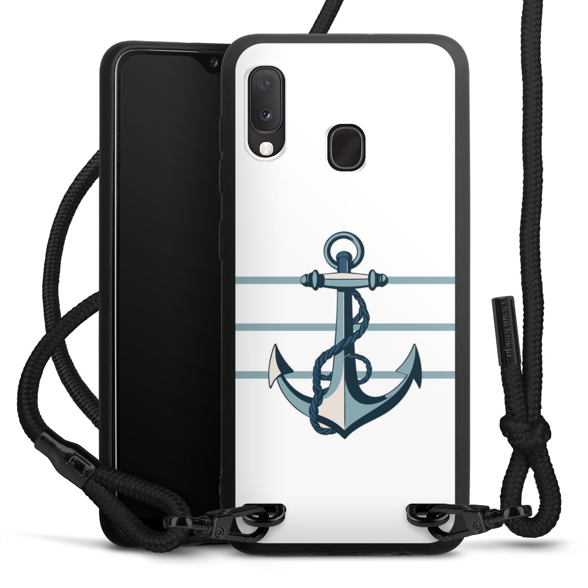 The matt black silicone case is made of flexible TPU (thermoplastic polyurethane) and offers robust protection. The durable, unbreakable material makes the cover flexible and dimensionally stable at the same time. The matte surface makes your design stand out more and is less susceptible to fingerprints and dirt. The stylish trend accessory fits comfortably in the hand and is perfectly complemented by the fabric (polyester) mobile phone strap. The braided fabric strap is approx. 1.70 metres long with a diameter of approx. 0.5 cm. Due to the special knotting technique, the length of the strap can be adjusted by simply pulling it, so that you can adapt it individually to your wishes. The practical case to wear around your neck is available with the fabric strap in black. As a little icing on the cake, we have provided the strap with a chic metal fastener in matt black. The strap is securely fastened to the case with loops made of high-quality genuine leather and press studs. The ends of the fabric strap are covered with metallic end caps and thus protected from fraying.