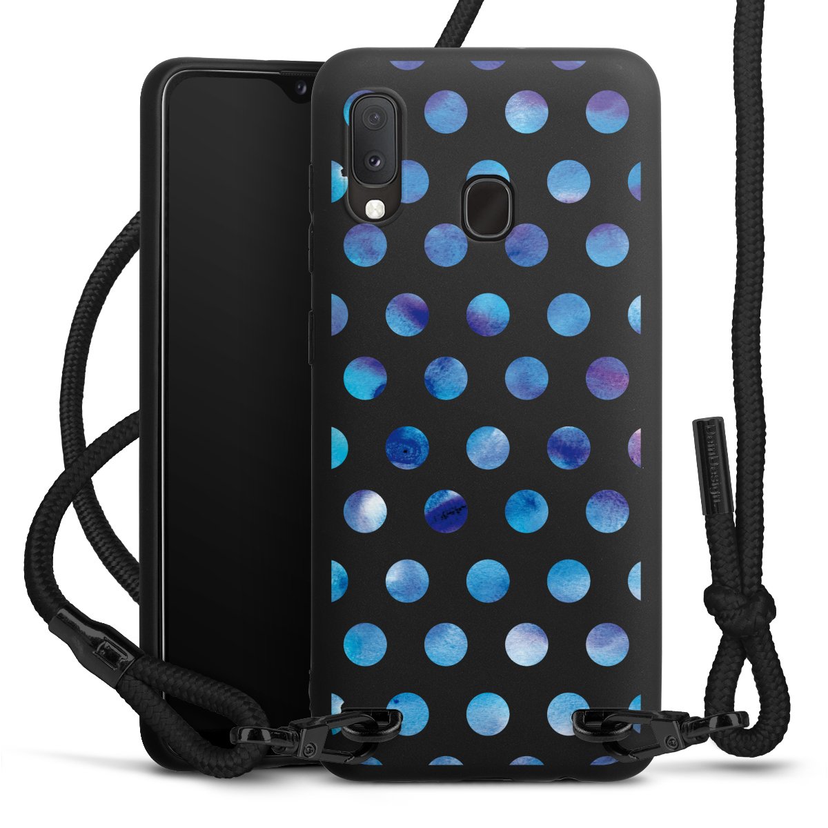 The matt black silicone case is made of flexible TPU (thermoplastic polyurethane) and offers robust protection. The durable, unbreakable material makes the cover flexible and dimensionally stable at the same time. The matte surface makes your design stand out more and is less susceptible to fingerprints and dirt. The stylish trend accessory fits comfortably in the hand and is perfectly complemented by the fabric (polyester) mobile phone strap. The braided fabric strap is approx. 1.70 metres long with a diameter of approx. 0.5 cm. Due to the special knotting technique, the length of the strap can be adjusted by simply pulling it, so that you can adapt it individually to your wishes. The practical case to wear around your neck is available with the fabric strap in black. As a little icing on the cake, we have provided the strap with a chic metal fastener in matt black. The strap is securely fastened to the case with loops made of high-quality genuine leather and press studs. The ends of the fabric strap are covered with metallic end caps and thus protected from fraying.