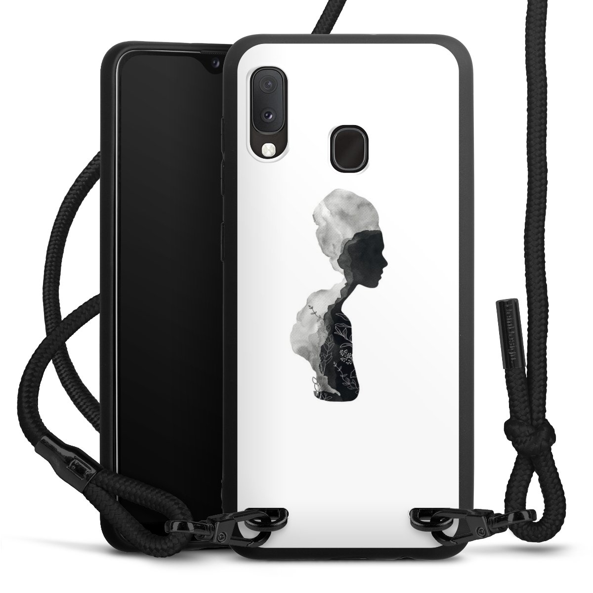 The matt black silicone case is made of flexible TPU (thermoplastic polyurethane) and offers robust protection. The durable, unbreakable material makes the cover flexible and dimensionally stable at the same time. The matte surface makes your design stand out more and is less susceptible to fingerprints and dirt. The stylish trend accessory fits comfortably in the hand and is perfectly complemented by the fabric (polyester) mobile phone strap. The braided fabric strap is approx. 1.70 metres long with a diameter of approx. 0.5 cm. Due to the special knotting technique, the length of the strap can be adjusted by simply pulling it, so that you can adapt it individually to your wishes. The practical case to wear around your neck is available with the fabric strap in black. As a little icing on the cake, we have provided the strap with a chic metal fastener in matt black. The strap is securely fastened to the case with loops made of high-quality genuine leather and press studs. The ends of the fabric strap are covered with metallic end caps and thus protected from fraying.