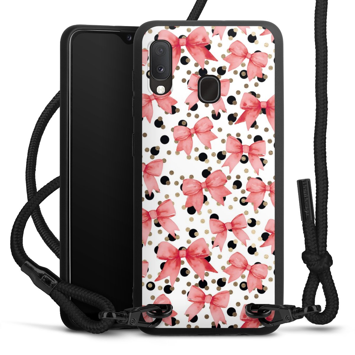 The matt black silicone case is made of flexible TPU (thermoplastic polyurethane) and offers robust protection. The durable, unbreakable material makes the cover flexible and dimensionally stable at the same time. The matte surface makes your design stand out more and is less susceptible to fingerprints and dirt. The stylish trend accessory fits comfortably in the hand and is perfectly complemented by the fabric (polyester) mobile phone strap. The braided fabric strap is approx. 1.70 metres long with a diameter of approx. 0.5 cm. Due to the special knotting technique, the length of the strap can be adjusted by simply pulling it, so that you can adapt it individually to your wishes. The practical case to wear around your neck is available with the fabric strap in black. As a little icing on the cake, we have provided the strap with a chic metal fastener in matt black. The strap is securely fastened to the case with loops made of high-quality genuine leather and press studs. The ends of the fabric strap are covered with metallic end caps and thus protected from fraying.