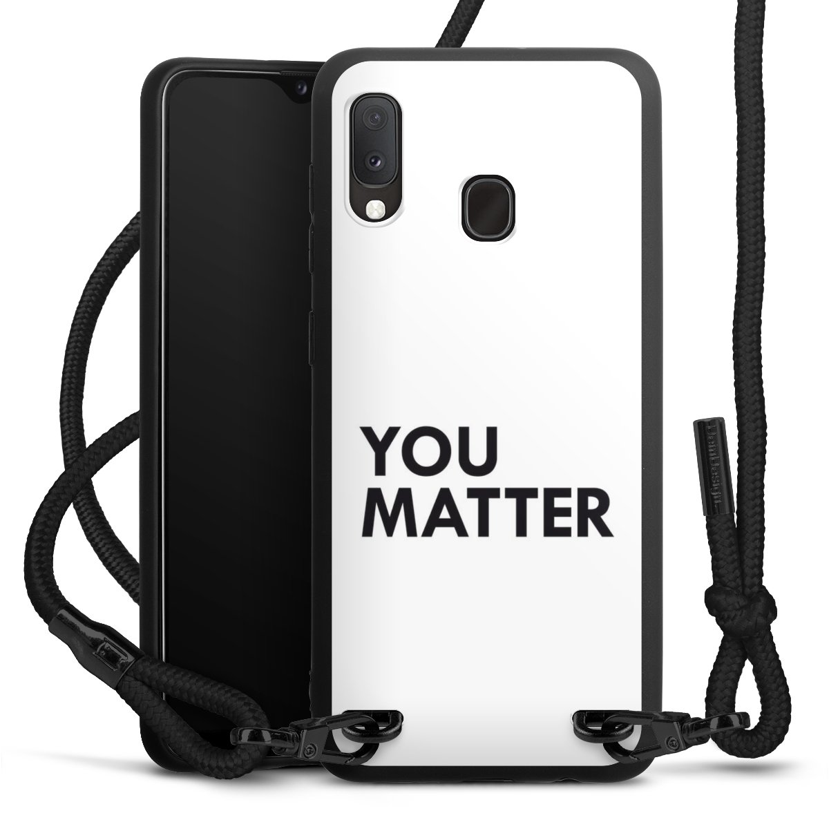 The matt black silicone case is made of flexible TPU (thermoplastic polyurethane) and offers robust protection. The durable, unbreakable material makes the cover flexible and dimensionally stable at the same time. The matte surface makes your design stand out more and is less susceptible to fingerprints and dirt. The stylish trend accessory fits comfortably in the hand and is perfectly complemented by the fabric (polyester) mobile phone strap. The braided fabric strap is approx. 1.70 metres long with a diameter of approx. 0.5 cm. Due to the special knotting technique, the length of the strap can be adjusted by simply pulling it, so that you can adapt it individually to your wishes. The practical case to wear around your neck is available with the fabric strap in black. As a little icing on the cake, we have provided the strap with a chic metal fastener in matt black. The strap is securely fastened to the case with loops made of high-quality genuine leather and press studs. The ends of the fabric strap are covered with metallic end caps and thus protected from fraying.