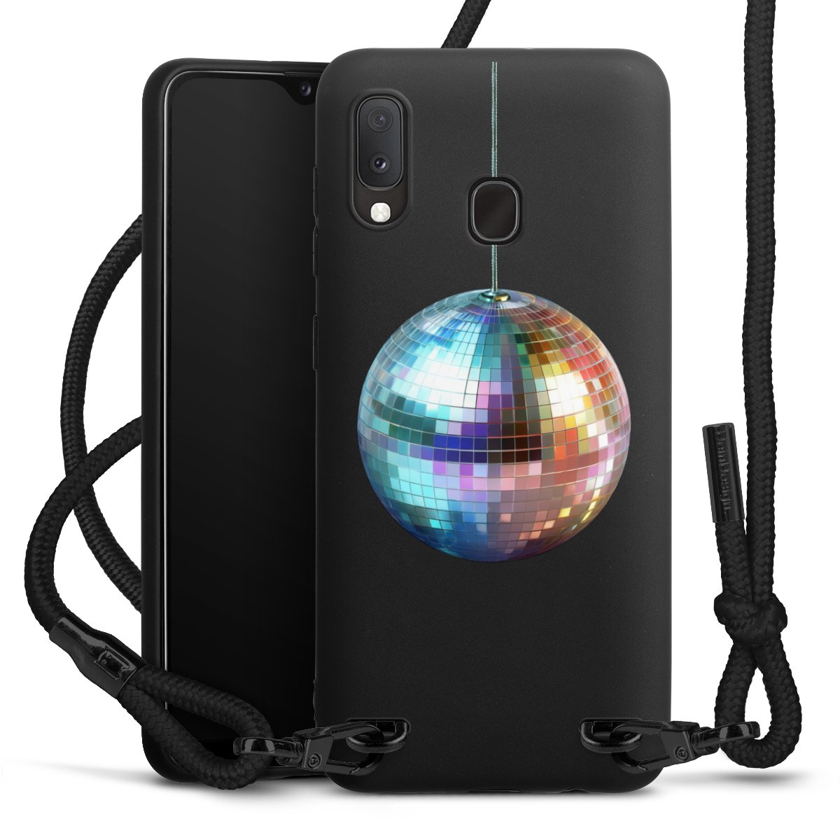 The matt black silicone case is made of flexible TPU (thermoplastic polyurethane) and offers robust protection. The durable, unbreakable material makes the cover flexible and dimensionally stable at the same time. The matte surface makes your design stand out more and is less susceptible to fingerprints and dirt. The stylish trend accessory fits comfortably in the hand and is perfectly complemented by the fabric (polyester) mobile phone strap. The braided fabric strap is approx. 1.70 metres long with a diameter of approx. 0.5 cm. Due to the special knotting technique, the length of the strap can be adjusted by simply pulling it, so that you can adapt it individually to your wishes. The practical case to wear around your neck is available with the fabric strap in black. As a little icing on the cake, we have provided the strap with a chic metal fastener in matt black. The strap is securely fastened to the case with loops made of high-quality genuine leather and press studs. The ends of the fabric strap are covered with metallic end caps and thus protected from fraying.