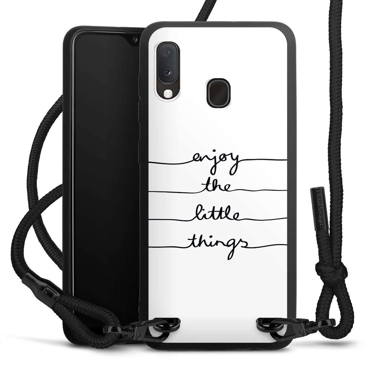 The matt black silicone case is made of flexible TPU (thermoplastic polyurethane) and offers robust protection. The durable, unbreakable material makes the cover flexible and dimensionally stable at the same time. The matte surface makes your design stand out more and is less susceptible to fingerprints and dirt. The stylish trend accessory fits comfortably in the hand and is perfectly complemented by the fabric (polyester) mobile phone strap. The braided fabric strap is approx. 1.70 metres long with a diameter of approx. 0.5 cm. Due to the special knotting technique, the length of the strap can be adjusted by simply pulling it, so that you can adapt it individually to your wishes. The practical case to wear around your neck is available with the fabric strap in black. As a little icing on the cake, we have provided the strap with a chic metal fastener in matt black. The strap is securely fastened to the case with loops made of high-quality genuine leather and press studs. The ends of the fabric strap are covered with metallic end caps and thus protected from fraying.