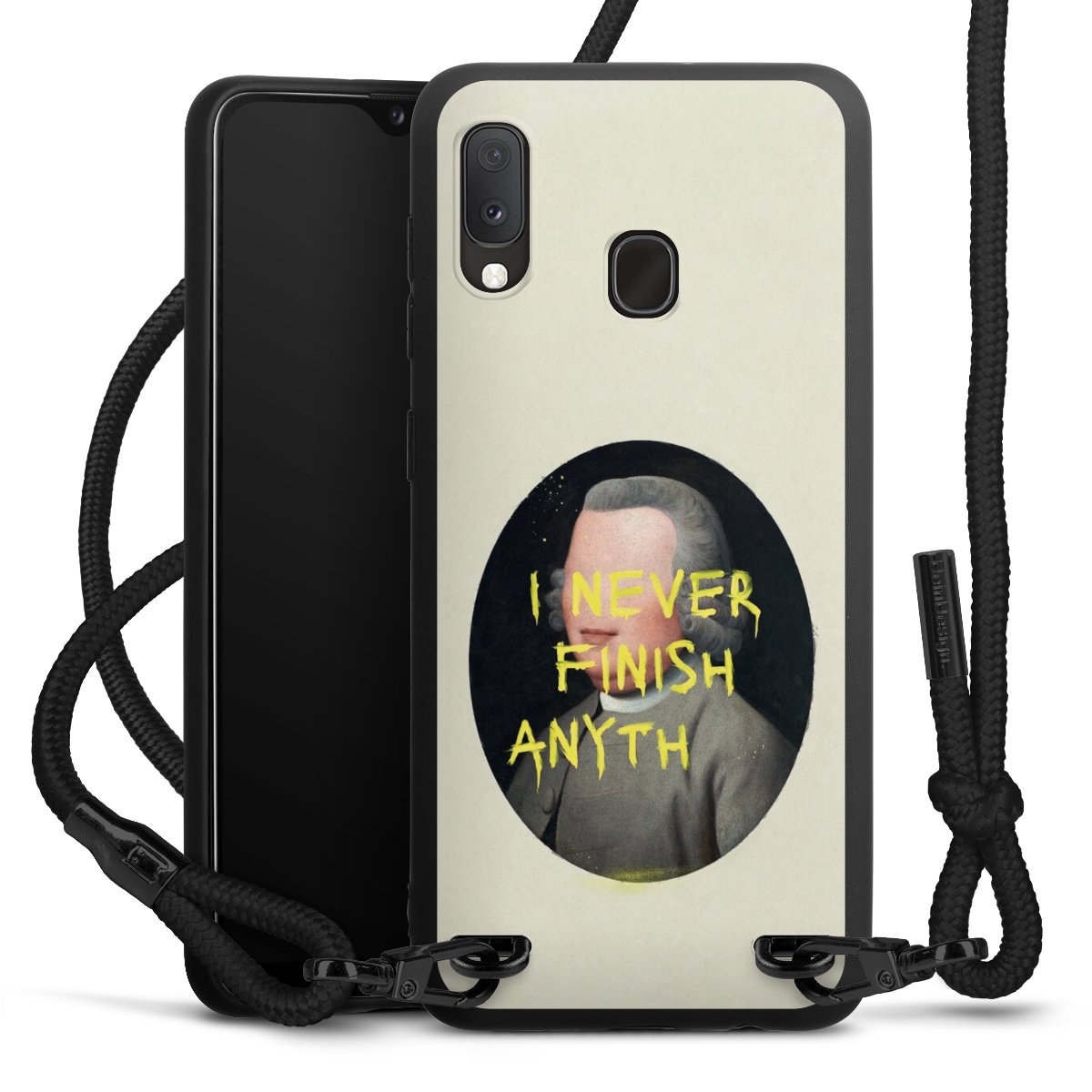 The matt black silicone case is made of flexible TPU (thermoplastic polyurethane) and offers robust protection. The durable, unbreakable material makes the cover flexible and dimensionally stable at the same time. The matte surface makes your design stand out more and is less susceptible to fingerprints and dirt. The stylish trend accessory fits comfortably in the hand and is perfectly complemented by the fabric (polyester) mobile phone strap. The braided fabric strap is approx. 1.70 metres long with a diameter of approx. 0.5 cm. Due to the special knotting technique, the length of the strap can be adjusted by simply pulling it, so that you can adapt it individually to your wishes. The practical case to wear around your neck is available with the fabric strap in black. As a little icing on the cake, we have provided the strap with a chic metal fastener in matt black. The strap is securely fastened to the case with loops made of high-quality genuine leather and press studs. The ends of the fabric strap are covered with metallic end caps and thus protected from fraying.