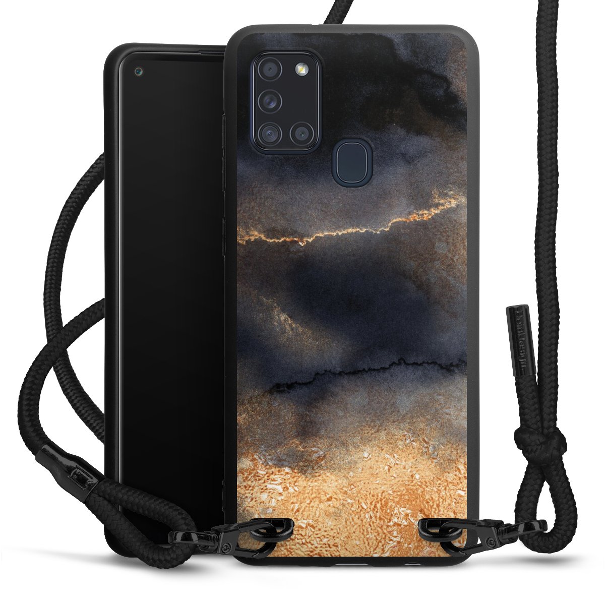The matt black silicone case is made of flexible TPU (thermoplastic polyurethane) and offers robust protection. The durable, unbreakable material makes the cover flexible and dimensionally stable at the same time. The matte surface makes your design stand out more and is less susceptible to fingerprints and dirt. The stylish trend accessory fits comfortably in the hand and is perfectly complemented by the fabric (polyester) mobile phone strap. The braided fabric strap is approx. 1.70 metres long with a diameter of approx. 0.5 cm. Due to the special knotting technique, the length of the strap can be adjusted by simply pulling it, so that you can adapt it individually to your wishes. The practical case to wear around your neck is available with the fabric strap in black. As a little icing on the cake, we have provided the strap with a chic metal fastener in matt black. The strap is securely fastened to the case with loops made of high-quality genuine leather and press studs. The ends of the fabric strap are covered with metallic end caps and thus protected from fraying.