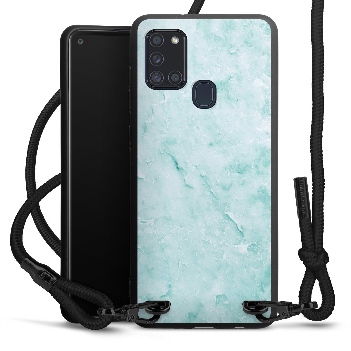 The matt black silicone case is made of flexible TPU (thermoplastic polyurethane) and offers robust protection. The durable, unbreakable material makes the cover flexible and dimensionally stable at the same time. The matte surface makes your design stand out more and is less susceptible to fingerprints and dirt. The stylish trend accessory fits comfortably in the hand and is perfectly complemented by the fabric (polyester) mobile phone strap. The braided fabric strap is approx. 1.70 metres long with a diameter of approx. 0.5 cm. Due to the special knotting technique, the length of the strap can be adjusted by simply pulling it, so that you can adapt it individually to your wishes. The practical case to wear around your neck is available with the fabric strap in black. As a little icing on the cake, we have provided the strap with a chic metal fastener in matt black. The strap is securely fastened to the case with loops made of high-quality genuine leather and press studs. The ends of the fabric strap are covered with metallic end caps and thus protected from fraying.
