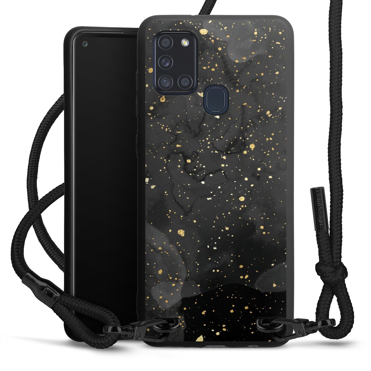 The matt black silicone case is made of flexible TPU (thermoplastic polyurethane) and offers robust protection. The durable, unbreakable material makes the cover flexible and dimensionally stable at the same time. The matte surface makes your design stand out more and is less susceptible to fingerprints and dirt. The stylish trend accessory fits comfortably in the hand and is perfectly complemented by the fabric (polyester) mobile phone strap. The braided fabric strap is approx. 1.70 metres long with a diameter of approx. 0.5 cm. Due to the special knotting technique, the length of the strap can be adjusted by simply pulling it, so that you can adapt it individually to your wishes. The practical case to wear around your neck is available with the fabric strap in black. As a little icing on the cake, we have provided the strap with a chic metal fastener in matt black. The strap is securely fastened to the case with loops made of high-quality genuine leather and press studs. The ends of the fabric strap are covered with metallic end caps and thus protected from fraying.