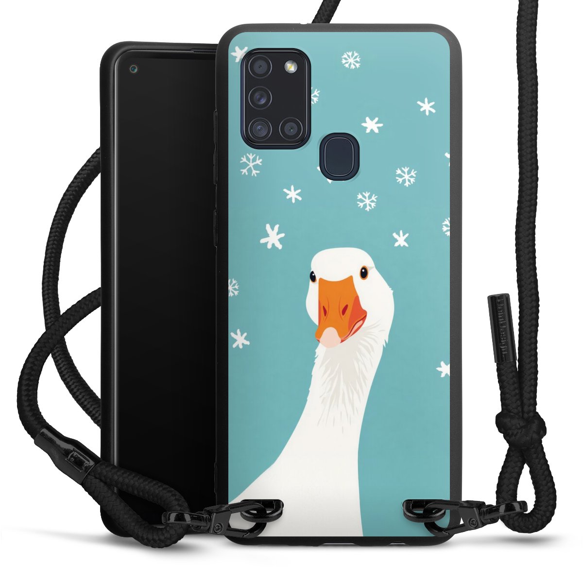 The matt black silicone case is made of flexible TPU (thermoplastic polyurethane) and offers robust protection. The durable, unbreakable material makes the cover flexible and dimensionally stable at the same time. The matte surface makes your design stand out more and is less susceptible to fingerprints and dirt. The stylish trend accessory fits comfortably in the hand and is perfectly complemented by the fabric (polyester) mobile phone strap. The braided fabric strap is approx. 1.70 metres long with a diameter of approx. 0.5 cm. Due to the special knotting technique, the length of the strap can be adjusted by simply pulling it, so that you can adapt it individually to your wishes. The practical case to wear around your neck is available with the fabric strap in black. As a little icing on the cake, we have provided the strap with a chic metal fastener in matt black. The strap is securely fastened to the case with loops made of high-quality genuine leather and press studs. The ends of the fabric strap are covered with metallic end caps and thus protected from fraying.