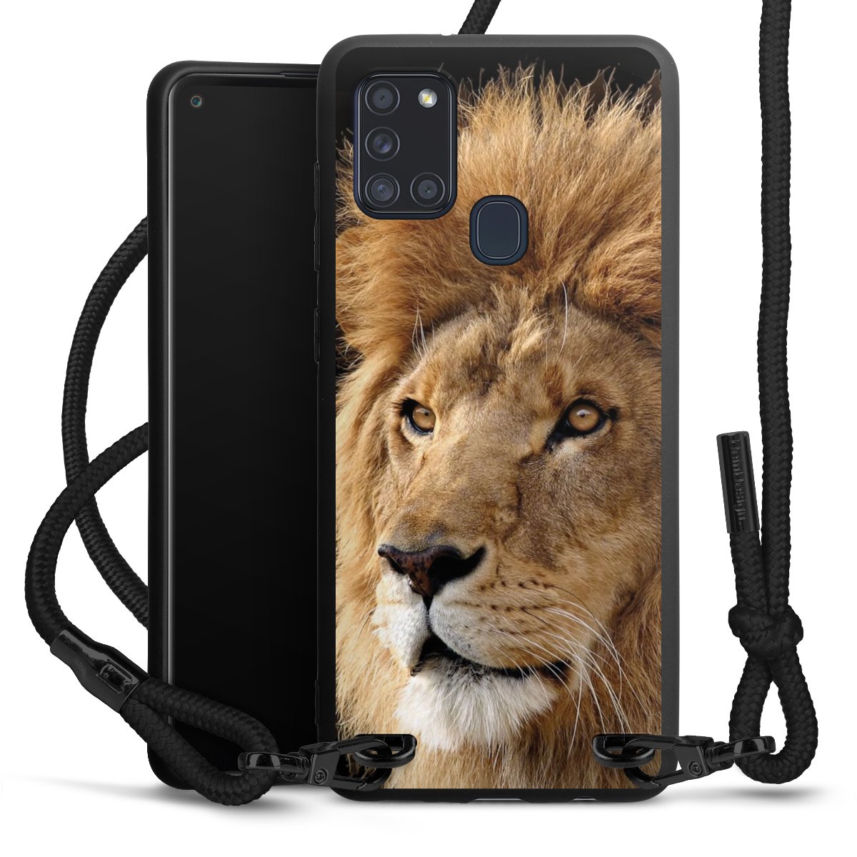 The matt black silicone case is made of flexible TPU (thermoplastic polyurethane) and offers robust protection. The durable, unbreakable material makes the cover flexible and dimensionally stable at the same time. The matte surface makes your design stand out more and is less susceptible to fingerprints and dirt. The stylish trend accessory fits comfortably in the hand and is perfectly complemented by the fabric (polyester) mobile phone strap. The braided fabric strap is approx. 1.70 metres long with a diameter of approx. 0.5 cm. Due to the special knotting technique, the length of the strap can be adjusted by simply pulling it, so that you can adapt it individually to your wishes. The practical case to wear around your neck is available with the fabric strap in black. As a little icing on the cake, we have provided the strap with a chic metal fastener in matt black. The strap is securely fastened to the case with loops made of high-quality genuine leather and press studs. The ends of the fabric strap are covered with metallic end caps and thus protected from fraying.
