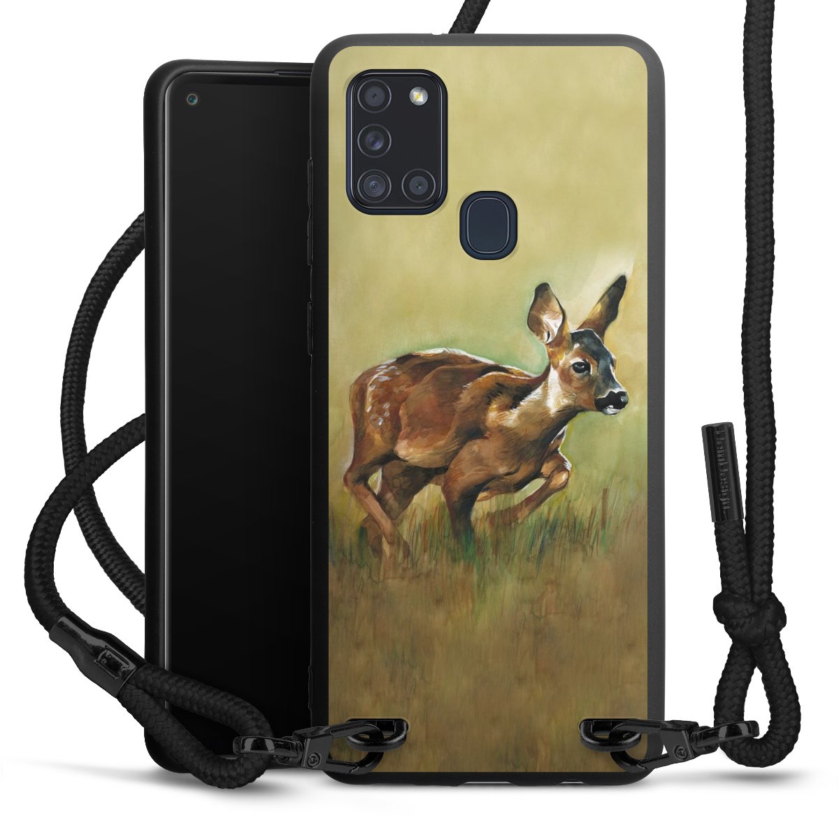The matt black silicone case is made of flexible TPU (thermoplastic polyurethane) and offers robust protection. The durable, unbreakable material makes the cover flexible and dimensionally stable at the same time. The matte surface makes your design stand out more and is less susceptible to fingerprints and dirt. The stylish trend accessory fits comfortably in the hand and is perfectly complemented by the fabric (polyester) mobile phone strap. The braided fabric strap is approx. 1.70 metres long with a diameter of approx. 0.5 cm. Due to the special knotting technique, the length of the strap can be adjusted by simply pulling it, so that you can adapt it individually to your wishes. The practical case to wear around your neck is available with the fabric strap in black. As a little icing on the cake, we have provided the strap with a chic metal fastener in matt black. The strap is securely fastened to the case with loops made of high-quality genuine leather and press studs. The ends of the fabric strap are covered with metallic end caps and thus protected from fraying.
