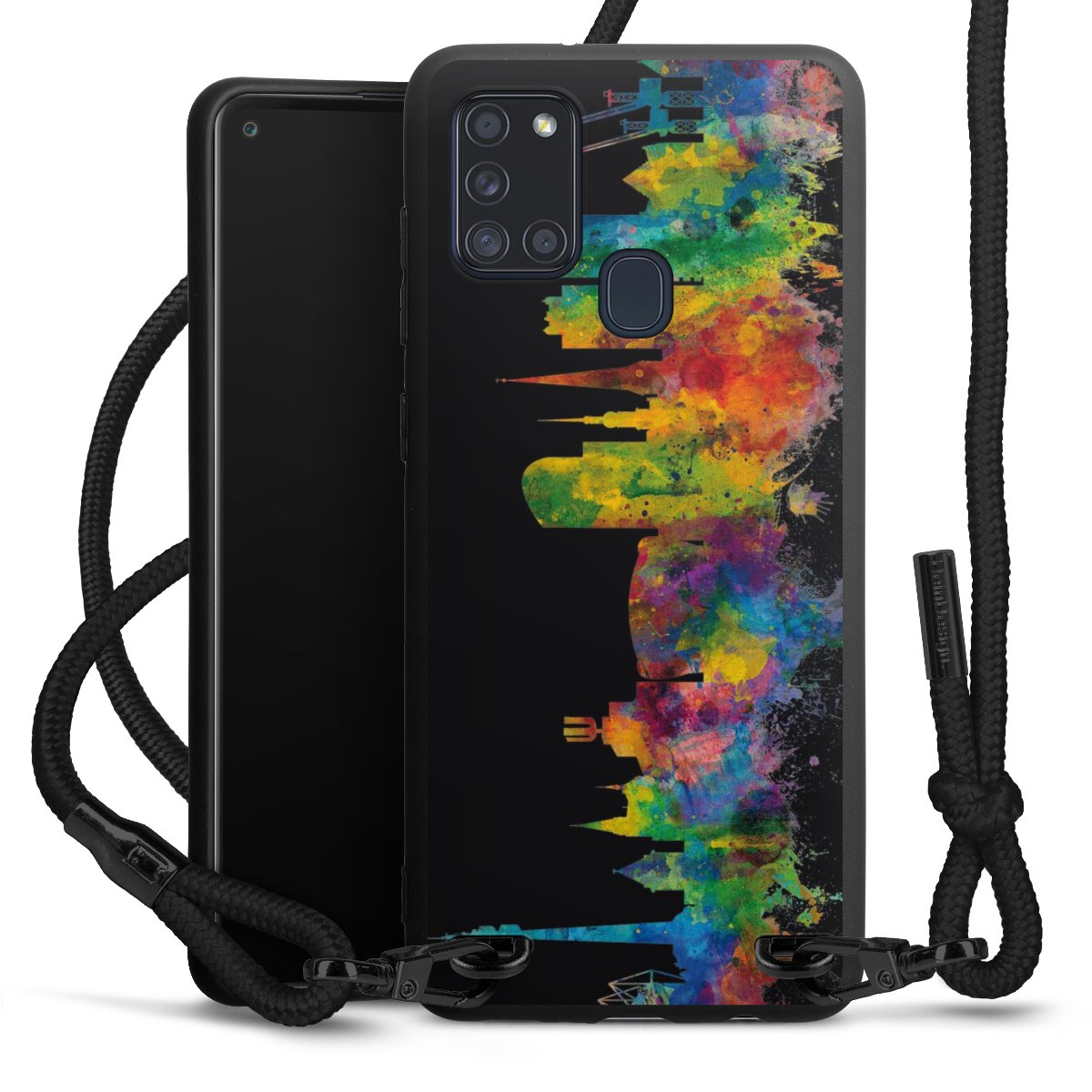 We use the solid direct print process for this phone case, which is why the print area only covers the back and the edge remains unprinted. The case to wear around your neck can be ordered unprinted, fully printed, or partially printed. For your design, either choose one of our exclusive shop motifs or get creative and create your own design, for example with photos and overlays. Design your own personal trend accessory and make an individual statement on the streets!