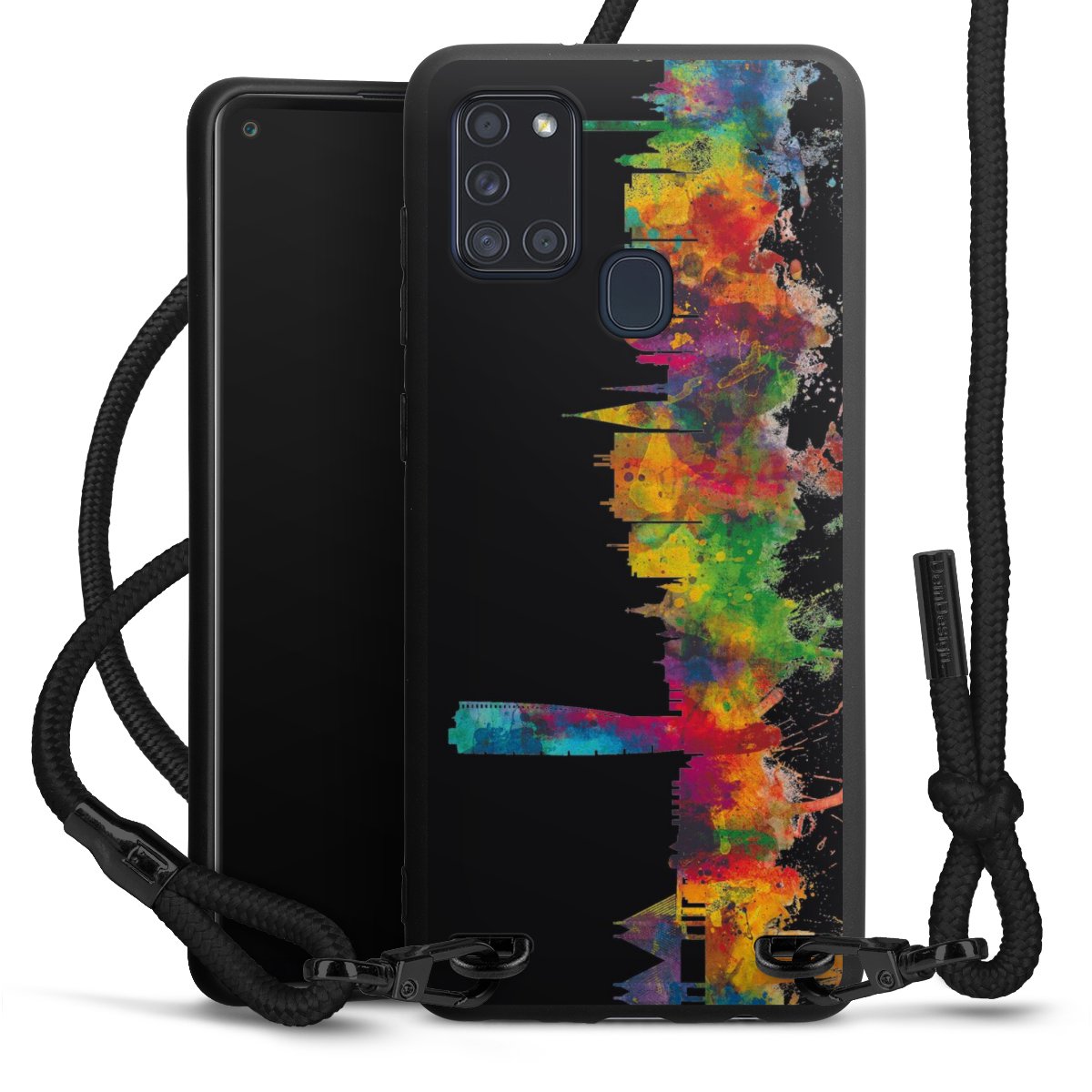 We use the solid direct print process for this phone case, which is why the print area only covers the back and the edge remains unprinted. The case to wear around your neck can be ordered unprinted, fully printed, or partially printed. For your design, either choose one of our exclusive shop motifs or get creative and create your own design, for example with photos and overlays. Design your own personal trend accessory and make an individual statement on the streets!