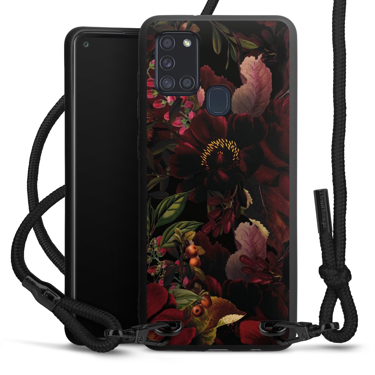 The matt black silicone case is made of flexible TPU (thermoplastic polyurethane) and offers robust protection. The durable, unbreakable material makes the cover flexible and dimensionally stable at the same time. The matte surface makes your design stand out more and is less susceptible to fingerprints and dirt. The stylish trend accessory fits comfortably in the hand and is perfectly complemented by the fabric (polyester) mobile phone strap. The braided fabric strap is approx. 1.70 metres long with a diameter of approx. 0.5 cm. Due to the special knotting technique, the length of the strap can be adjusted by simply pulling it, so that you can adapt it individually to your wishes. The practical case to wear around your neck is available with the fabric strap in black. As a little icing on the cake, we have provided the strap with a chic metal fastener in matt black. The strap is securely fastened to the case with loops made of high-quality genuine leather and press studs. The ends of the fabric strap are covered with metallic end caps and thus protected from fraying.