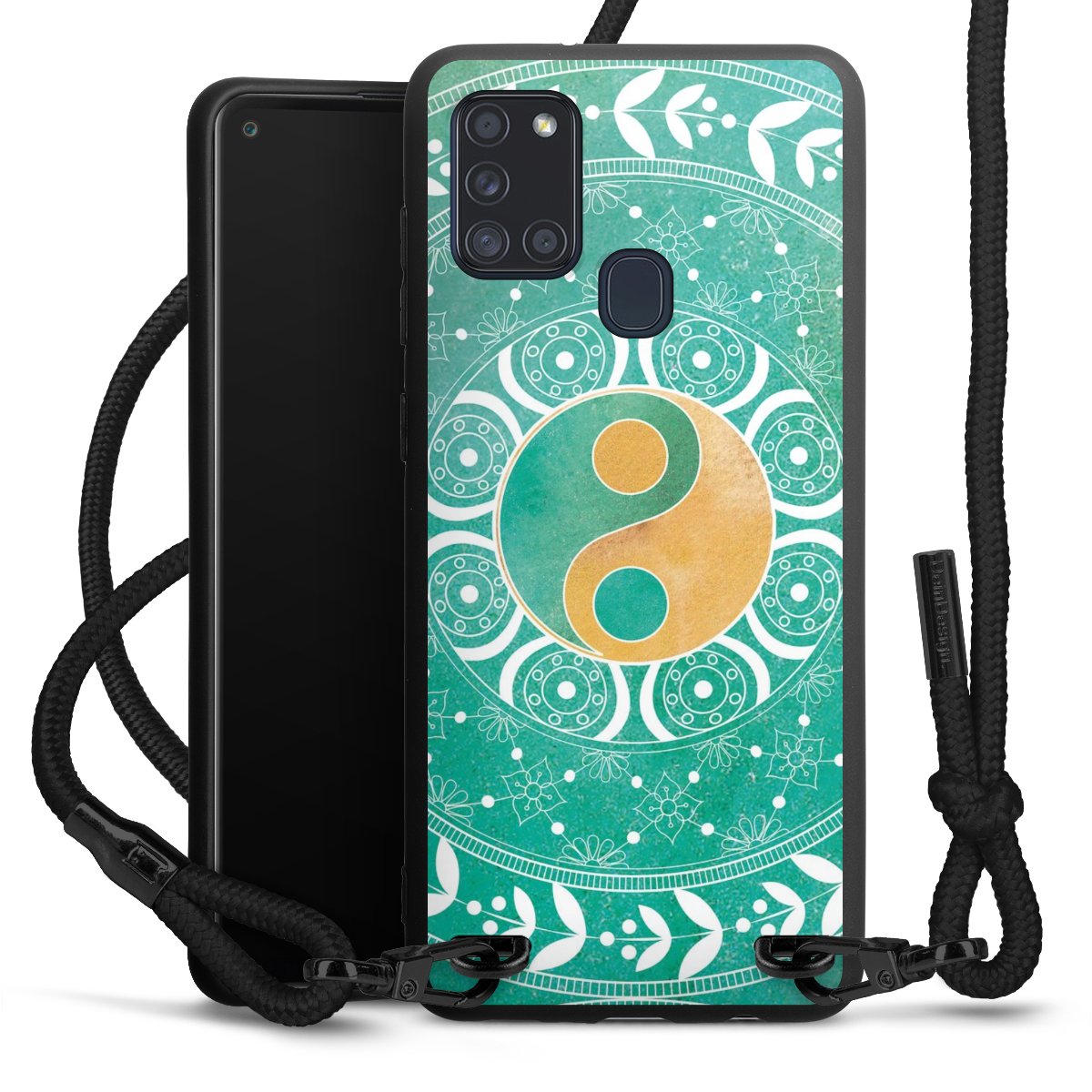 The matt black silicone case is made of flexible TPU (thermoplastic polyurethane) and offers robust protection. The durable, unbreakable material makes the cover flexible and dimensionally stable at the same time. The matte surface makes your design stand out more and is less susceptible to fingerprints and dirt. The stylish trend accessory fits comfortably in the hand and is perfectly complemented by the fabric (polyester) mobile phone strap. The braided fabric strap is approx. 1.70 metres long with a diameter of approx. 0.5 cm. Due to the special knotting technique, the length of the strap can be adjusted by simply pulling it, so that you can adapt it individually to your wishes. The practical case to wear around your neck is available with the fabric strap in black. As a little icing on the cake, we have provided the strap with a chic metal fastener in matt black. The strap is securely fastened to the case with loops made of high-quality genuine leather and press studs. The ends of the fabric strap are covered with metallic end caps and thus protected from fraying.