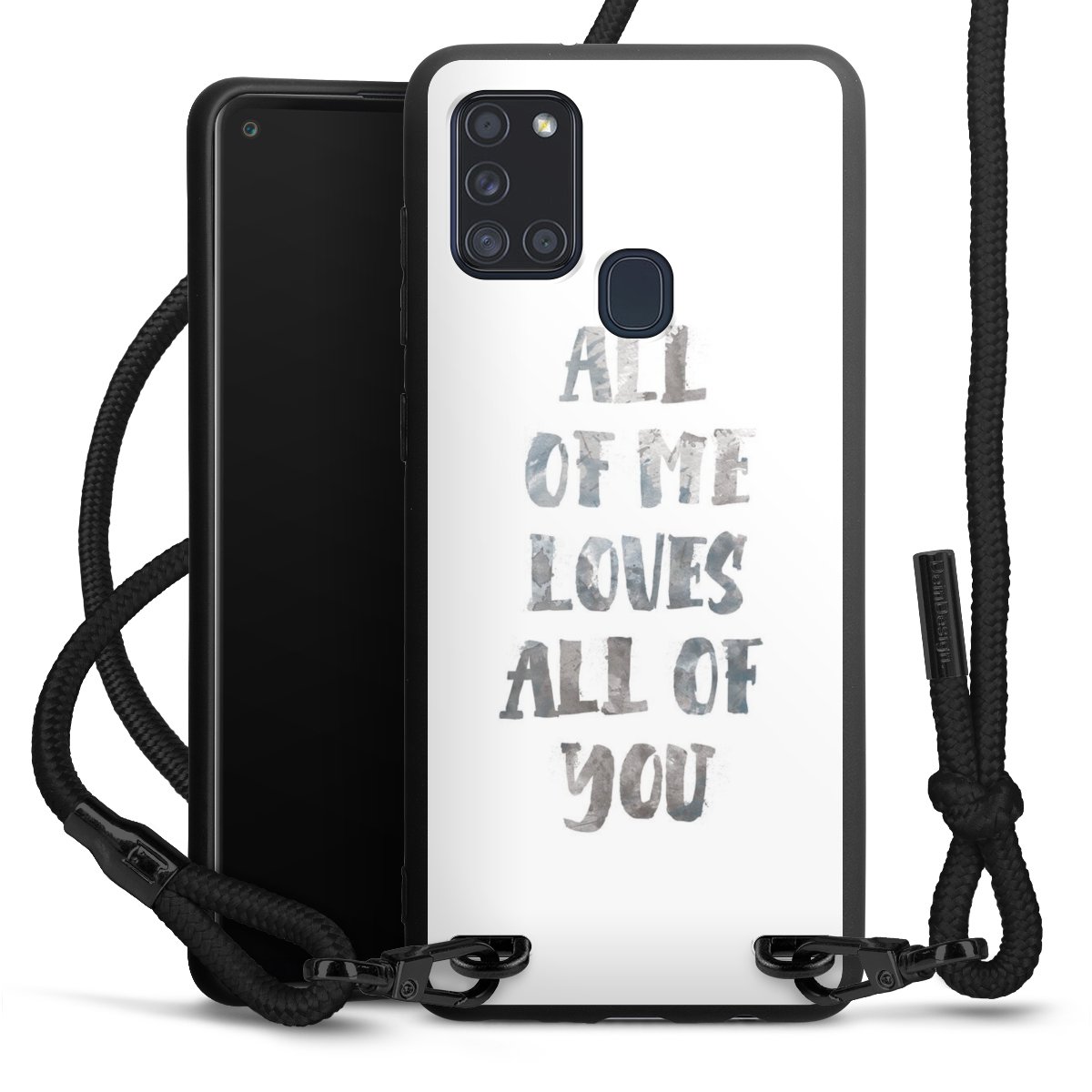 The matt black silicone case is made of flexible TPU (thermoplastic polyurethane) and offers robust protection. The durable, unbreakable material makes the cover flexible and dimensionally stable at the same time. The matte surface makes your design stand out more and is less susceptible to fingerprints and dirt. The stylish trend accessory fits comfortably in the hand and is perfectly complemented by the fabric (polyester) mobile phone strap. The braided fabric strap is approx. 1.70 metres long with a diameter of approx. 0.5 cm. Due to the special knotting technique, the length of the strap can be adjusted by simply pulling it, so that you can adapt it individually to your wishes. The practical case to wear around your neck is available with the fabric strap in black. As a little icing on the cake, we have provided the strap with a chic metal fastener in matt black. The strap is securely fastened to the case with loops made of high-quality genuine leather and press studs. The ends of the fabric strap are covered with metallic end caps and thus protected from fraying.