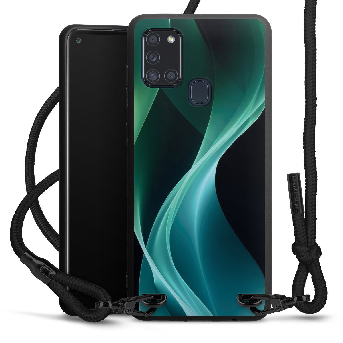 The matt black silicone case is made of flexible TPU (thermoplastic polyurethane) and offers robust protection. The durable, unbreakable material makes the cover flexible and dimensionally stable at the same time. The matte surface makes your design stand out more and is less susceptible to fingerprints and dirt. The stylish trend accessory fits comfortably in the hand and is perfectly complemented by the fabric (polyester) mobile phone strap. The braided fabric strap is approx. 1.70 metres long with a diameter of approx. 0.5 cm. Due to the special knotting technique, the length of the strap can be adjusted by simply pulling it, so that you can adapt it individually to your wishes. The practical case to wear around your neck is available with the fabric strap in black. As a little icing on the cake, we have provided the strap with a chic metal fastener in matt black. The strap is securely fastened to the case with loops made of high-quality genuine leather and press studs. The ends of the fabric strap are covered with metallic end caps and thus protected from fraying.