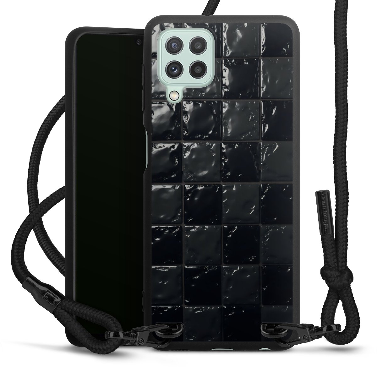The matt black silicone case is made of flexible TPU (thermoplastic polyurethane) and offers robust protection. The durable, unbreakable material makes the cover flexible and dimensionally stable at the same time. The matte surface makes your design stand out more and is less susceptible to fingerprints and dirt. The stylish trend accessory fits comfortably in the hand and is perfectly complemented by the fabric (polyester) mobile phone strap. The braided fabric strap is approx. 1.70 metres long with a diameter of approx. 0.5 cm. Due to the special knotting technique, the length of the strap can be adjusted by simply pulling it, so that you can adapt it individually to your wishes. The practical case to wear around your neck is available with the fabric strap in black. As a little icing on the cake, we have provided the strap with a chic metal fastener in matt black. The strap is securely fastened to the case with loops made of high-quality genuine leather and press studs. The ends of the fabric strap are covered with metallic end caps and thus protected from fraying.