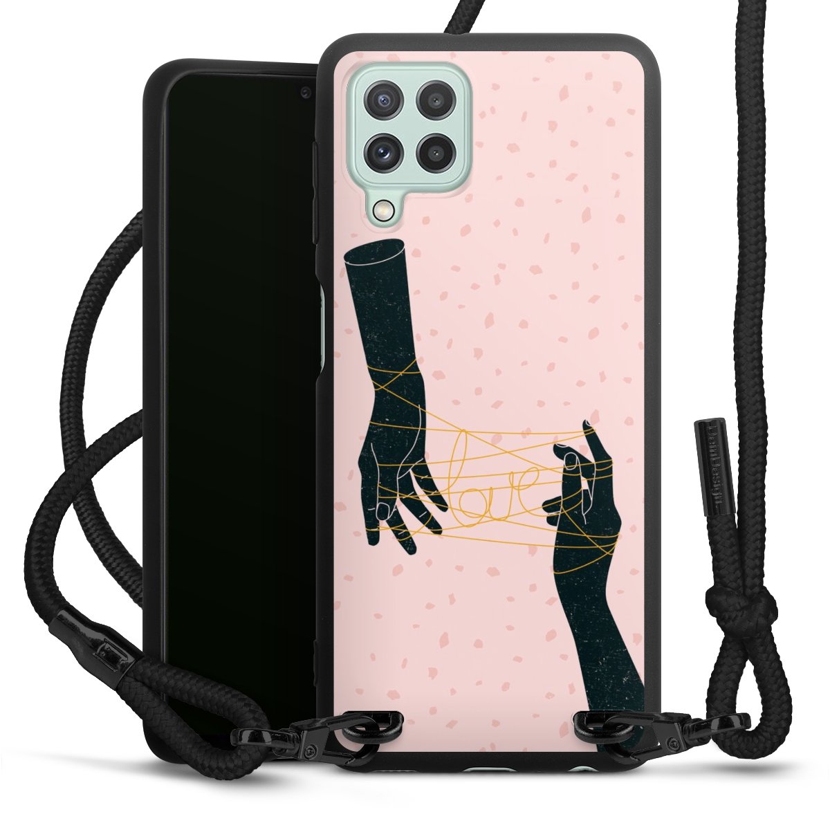 The matt black silicone case is made of flexible TPU (thermoplastic polyurethane) and offers robust protection. The durable, unbreakable material makes the cover flexible and dimensionally stable at the same time. The matte surface makes your design stand out more and is less susceptible to fingerprints and dirt. The stylish trend accessory fits comfortably in the hand and is perfectly complemented by the fabric (polyester) mobile phone strap. The braided fabric strap is approx. 1.70 metres long with a diameter of approx. 0.5 cm. Due to the special knotting technique, the length of the strap can be adjusted by simply pulling it, so that you can adapt it individually to your wishes. The practical case to wear around your neck is available with the fabric strap in black. As a little icing on the cake, we have provided the strap with a chic metal fastener in matt black. The strap is securely fastened to the case with loops made of high-quality genuine leather and press studs. The ends of the fabric strap are covered with metallic end caps and thus protected from fraying.