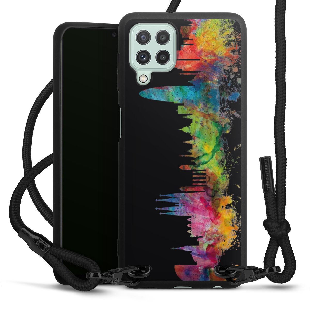 We use the solid direct print process for this phone case, which is why the print area only covers the back and the edge remains unprinted. The case to wear around your neck can be ordered unprinted, fully printed, or partially printed. For your design, either choose one of our exclusive shop motifs or get creative and create your own design, for example with photos and overlays. Design your own personal trend accessory and make an individual statement on the streets!