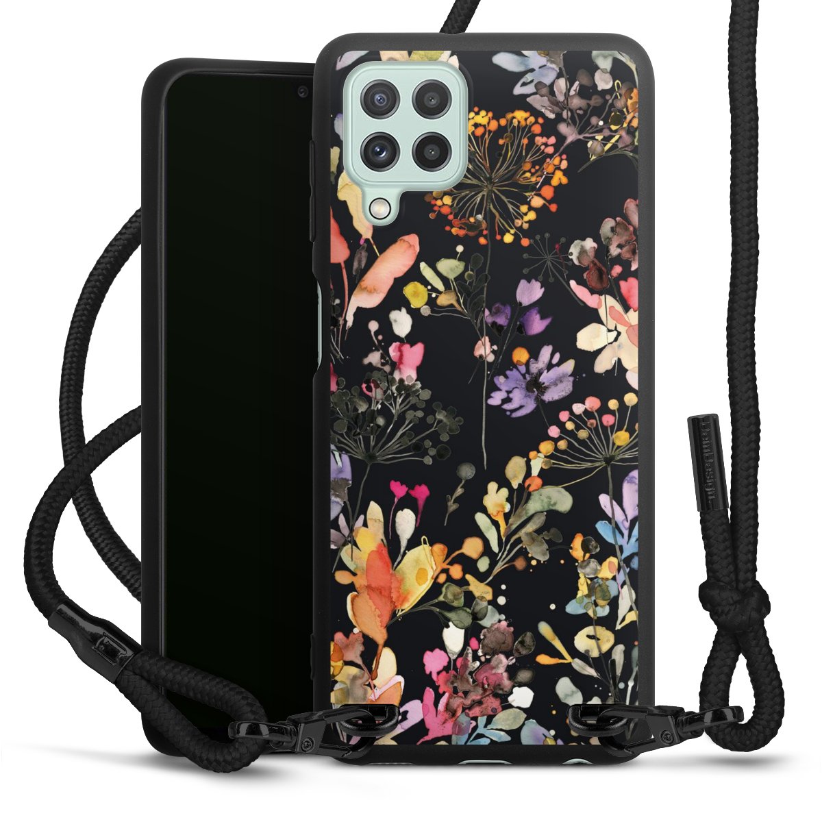 The matt black silicone case is made of flexible TPU (thermoplastic polyurethane) and offers robust protection. The durable, unbreakable material makes the cover flexible and dimensionally stable at the same time. The matte surface makes your design stand out more and is less susceptible to fingerprints and dirt. The stylish trend accessory fits comfortably in the hand and is perfectly complemented by the fabric (polyester) mobile phone strap. The braided fabric strap is approx. 1.70 metres long with a diameter of approx. 0.5 cm. Due to the special knotting technique, the length of the strap can be adjusted by simply pulling it, so that you can adapt it individually to your wishes. The practical case to wear around your neck is available with the fabric strap in black. As a little icing on the cake, we have provided the strap with a chic metal fastener in matt black. The strap is securely fastened to the case with loops made of high-quality genuine leather and press studs. The ends of the fabric strap are covered with metallic end caps and thus protected from fraying.