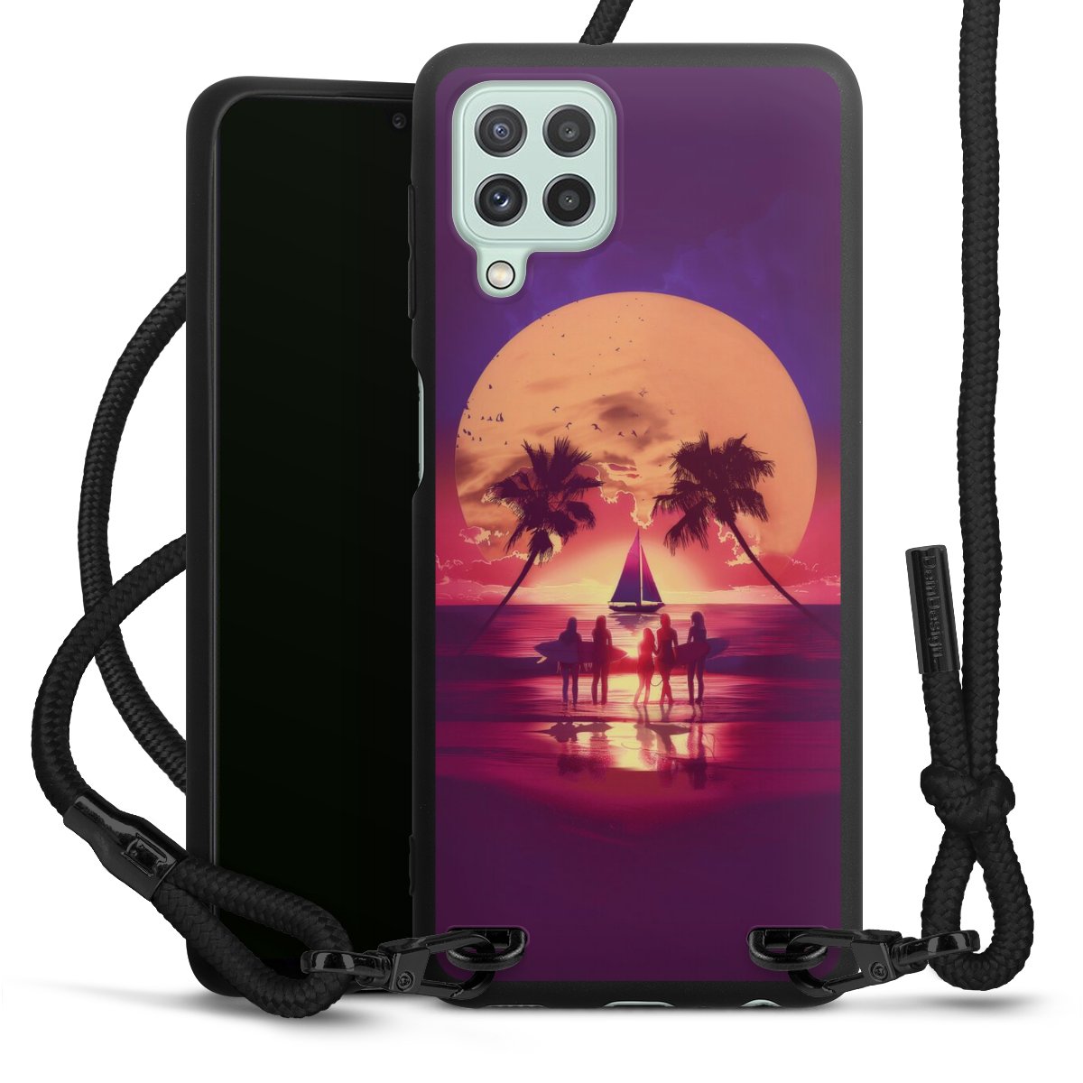We use the solid direct print process for this phone case, which is why the print area only covers the back and the edge remains unprinted. The case to wear around your neck can be ordered unprinted, fully printed, or partially printed. For your design, either choose one of our exclusive shop motifs or get creative and create your own design, for example with photos and overlays. Design your own personal trend accessory and make an individual statement on the streets!